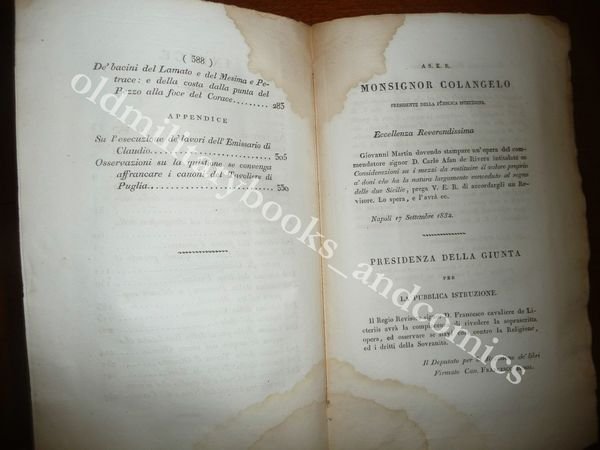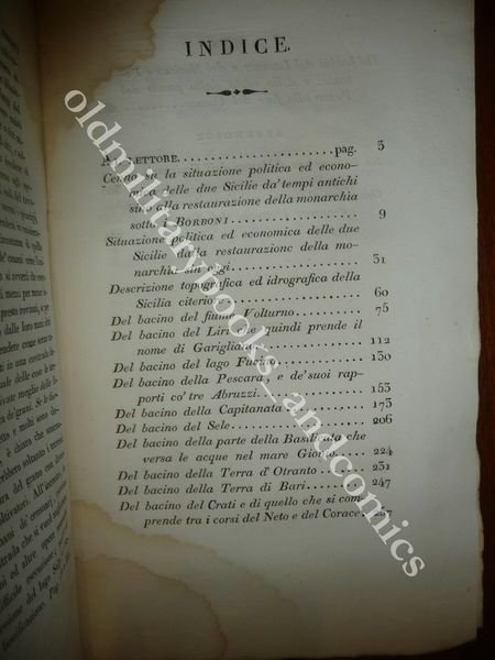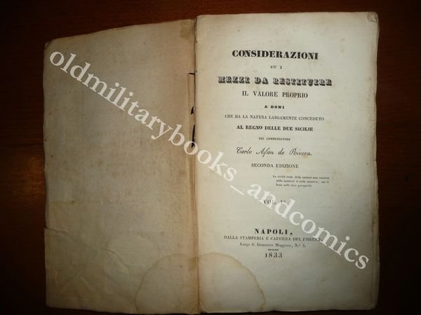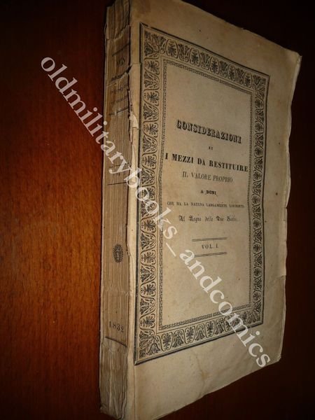 TITOLO: CONSIDERAZIONI SU I MEZZI DA RESTITUIRE IL VALORE PROPRIO A' DONI CHE HA LA NATURA LARGAMENTE CONCEDUTO Vol. I DESCRIZIONE: Napoli dalla dalla Stamperia e Cartiera del Fibreno 1833 Seconda Edizione, br. ed. pp. 388 (4) con 2 tavole incise su rame, ripiegate f.t. raffiguranti una la carta del Lago del Fucino e l'altra Carta Idrografica ed itineraria della Sicilia Citeriore per l'anno 1833 in 8°. Il primo volume di questa importante opera comprende una dettagliata descrizione dei bacini dei fiumi e dei laghi, più importanti del Regno delle Due Sicilie dagli Abruzzi alla Calabria. Vol.I Indice: Cenno su la situazione politica e economica delle due Sicilie da' tempi antichi sino alla restaurazione della monarchia sotto i Borboni; Situazione poltica e economica delle due Sicilie dalla restaurazione alla monarchia sin oggi; Descrizione topografica e idrografica della Sicilia citeriore; Bacino del fiume Volturno; Bacino del Liri che quindi prende nome Garigliano; Bacino del lago Fucino; Bacino della Pescara e suoi rapporti co' tre Abruzzi; Bacino della Capitanata; Bacino del Sele; Bacino della parte della Basilicata che versa le acque nel mar Gionio; Bacino della Terra d'Otranto; Bacino della Terra di Bari; Bacino del Crati e quello che si comprende tra i corsi del Neto e Corace; Bacino del La - mato. Mesima e Petrace e costa da punta del Pezzo alla foce del Corace. Append.: Su l'esecuzione de' lavori dell'emissario di Claudio; Su la questione se convenga affrancar i canoni del Tavoliere di Puglia. CONDIZIONI: Buone, vol. con cop. con parziale distacco al dorso ed una gora che interessa l'ultima parte del vol. carte comprese come da foto PESO / WEIGHT: 408 gr. without package