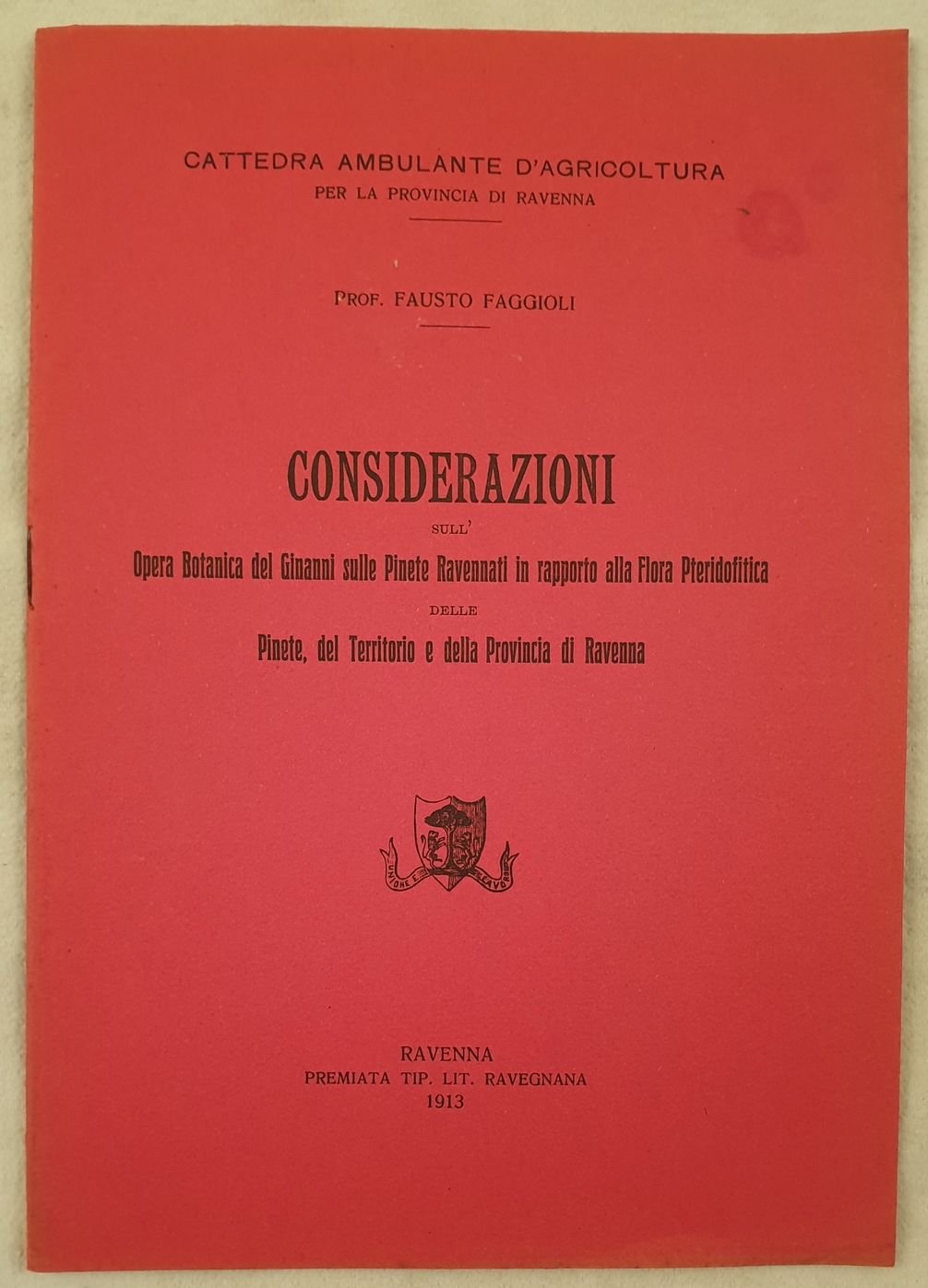 Interessante studio del 1913 sulle felci nelle pinete ravennati in rapporto a quanto enunciato da Francesco Ginanni nella sua opera " Istoria civile e naturale delle pinete Ravennati " pubblicata nel 1774. Faggioli esamina le pinete di Ravenna e le pteridofite presenti. In ottime condizioni. Copertina editoriale in ottime condizioni. Legatura in ottime condizioni. Pagine in ottime condizioni con rare fioriture. In 8. Dim. 24x17 cm. Pp. 18. Interesting study about the ferns in the pinewood of Ravenna in relation to what stated by Francesco Ginanni in his work " Istoria civile e naturale delle pinete Ravennati " published in 1774. Faggioli examinates all the ferns in the pinewoods of Ravenna and its ferns. In very good general conditions. Editorial cover. In 8. Dim. 24x17 cm. Pp. 18.