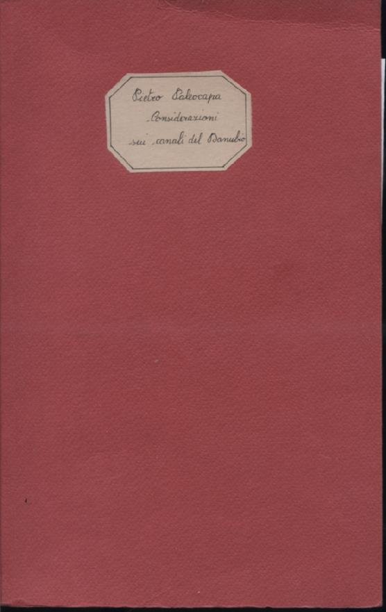 In-8°, pp. 106, brossura posteriore rossa con titolo calligrafato su tassello cartaceo ottagonale al piatto. Manca la carta litografica ripiegata delle bocche del Danubio. Edizione originale di questa rara memoria del Paleocapa pubblicata a cura del Ministero della Marina e svolta in forma di lettera ad Alfonso La Marmora. In fine, 'Prima appendice alle considerazioni sulla scelta del ramo del Danubiano da preferirsi per la regolazione stabile' e e 'Seconda appendice sui lavori provvisionali alla bocca di Soulina'. Il Paleocapa (Nese, Bergamo, 1788-Torino, 1869) fu ingegnre e uomo politico, distintosi per i lavori sulla regolazione del Brenta, dell'Adige e del Tibisco, per la costruzione della diga di Malamocco; i suoi scritti vertono principalmente su materie ferroviarie e idrauliche. Membro del governo provvisorio veneziano nel 1848, deputato al Parlamento Subalpino, Ministro dei Lavori Pubblici nei governi di Casati, D'Azeglio e Cavour e poi Ministro senza portafoglio, senatore e Cavaliere della SS. Annunziata fu uno dei maggiori artefici dell'ampliamento stradale e ferroviario del Piemonte. Per un elenco delle sue opere, cfr. L. Torelli, 'Elenco generale degli scritti editi ed inediti dell'illustre P.P.', Venezia, 1871. Poggendorff, III, parte seconda, col. 1000.