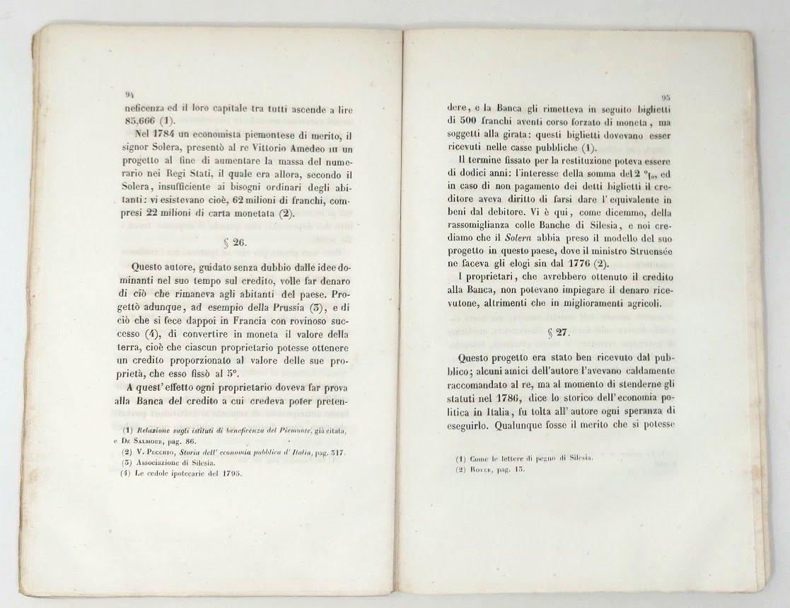 >in-8, pp. 218 (le prime 35 in numeraz. romana), broch. edit. Prima edizione di questo raro trattatello che s'inserisce nella discussione aperta l'anno precedente dal conte di Salmour circa l'utilità del credito agrario negli Stati Sardi, sulla cui efficacia l'autore esprime dubbi. Buon esemplare. Manca a Kress Ital. Cat. Einaudi 3615. Manno-Promis I, 2446.