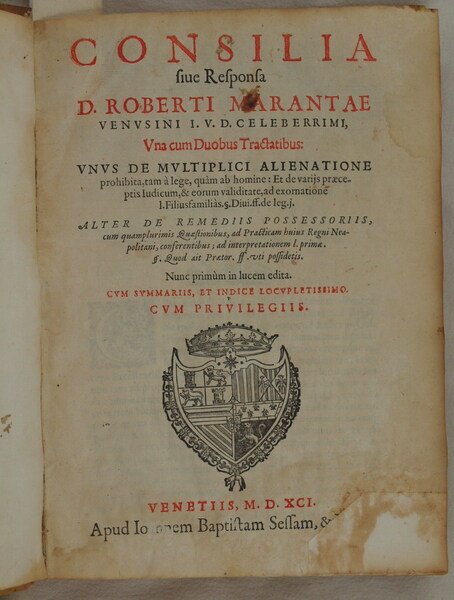 In 4. Dim. 28x21,5 cm. Pp. (24)+180+(1)+68+(1). Rara opera del 1591 del giurista Roberto Maranta (1746-1530) nato a Venosa. Maranta si laureò a Napoli nel 102 e dedicò tutta la sua vita allo studio e pratica della legge. Lavorò e studiò a Salerno, Palermo e Napoli. L’opera sono una serie di consigli con risposta sulle materie giuridiche dell’alienazione e dei rimedi della possessione. Testo a doppia colonna e numerazione singola. In buone condizioni e completo. Belle vignette all'interno Copertina in piena pergamena coeva con titolo manoscritto al dorso in buone condizioni generali con lievi usure ai margini e dorso. Segni di tarlo (vedere foto). Legatura in buone condizioni. All'interno le pagine si presentano in buone condizioni con fioriture. Lievi gore d’umidità marginali. Parte mancante al frontespizio e alle pagine dalla 60 alla finale 68 con perdita di qualche porzione di lettera a pag. 67. Segni di tarlo ai contropiatti e sguardie. Scarce work of 1591 by the jurist Roberto Maranta (1746-1530) botn in Venosa. Maranta got a degree in Naples in 1502 and dedicated his entire life to the study and practice of law. He worked and studied in Salerno, Palermo and Napoli. The work are a series of suggestions with reponse about matters of alienation and remedies of possession. Text in double column and single numbering. In good conditions and complete. Beautiful vignettes inside. Full parchment coeval cover with handwritten title in the spine in good general conditions slightly worn in the edges and spine. Worming (see the photo). Binding in good conditions. Inside pages are in good conditions with foxings and water stains in the edges. Missing part in title page and pages from 60 until the final 68 with loss of some portion of letter in pag. 67. Worming in counterplates and endpages.