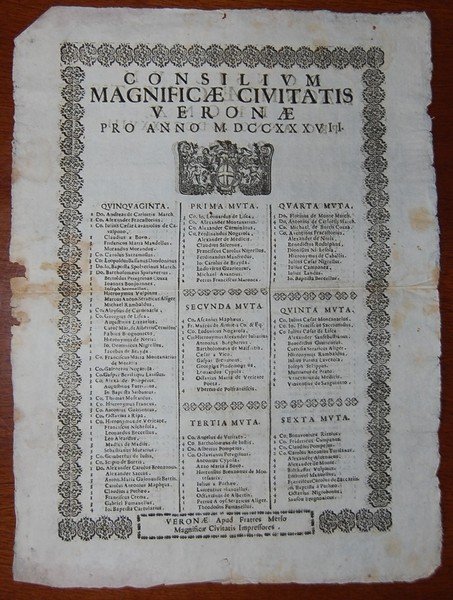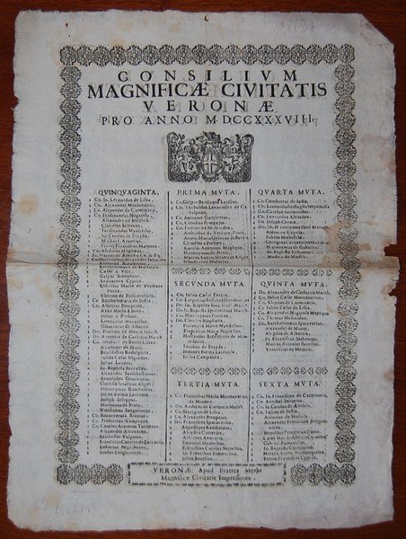 41,5x30 cm; folio volante. Interessantissima grida del 1738 che, stampata fronte e retro, riporta i nomi di tutti i cittadini veronesi facenti parte del Consiglio Cittadino di Veron negli anni 1737 e i 1738. Bello stemma, su ambo i lati, con Leone di San Marco che sovrasta scudo cittadino sorretto da due putti. L'elenco dei personaggi facenti parti il "Consiglio Cittadino" è stampato entro bella cornice xilografica. Qualche leggerissima macchiolina e segno d'umidità al amrgine esterno. Due piccolissimo forellini ininfluenti e che non toccano il testo e nel complesso buono-discreto stato di conservazione. NON COMUNE.