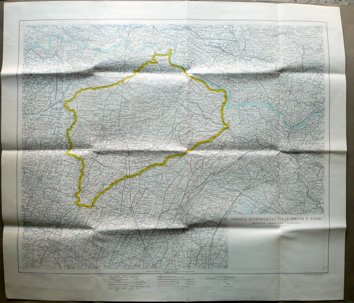 Carta topografica a colori, Consorzio Interprovinciale per la Bonifica di Burana (Modena - Mantova - Ferrara) Grande carta topografica con dettagli a colori Scala 1:100000 Litografia Artistica Cartografica, Firenze, s. d.; grande carta topografica a stampa con dettagli a colori; legenda al margine inf. Cm 68,5x78. Condizioni di conservazione Esemplare ben conservato con leggere tracce d'uso. SC03.D12799 N bis