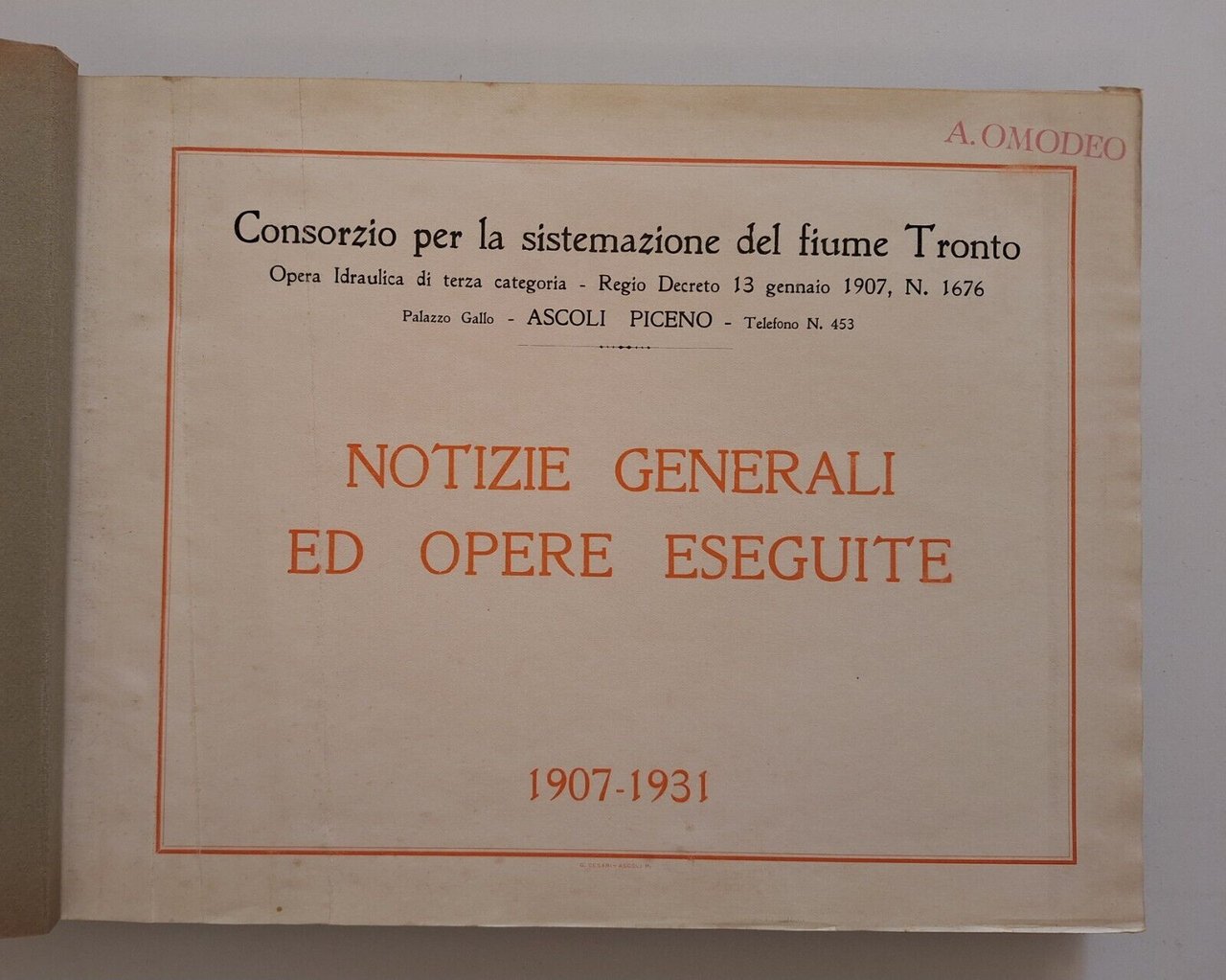 CONSORZIO PER LA SISTEMAZIONE DEL FIUME TRONTO NOTIZIE GENERALI ED OPERE GENERALI 1907-1931In 4° orizzontale, pag. 21 di testo, legatura editoriale, copertina illustrata, 40 tavole in b/n.Lievi segni alla copertina, pagine fresche e pulite.