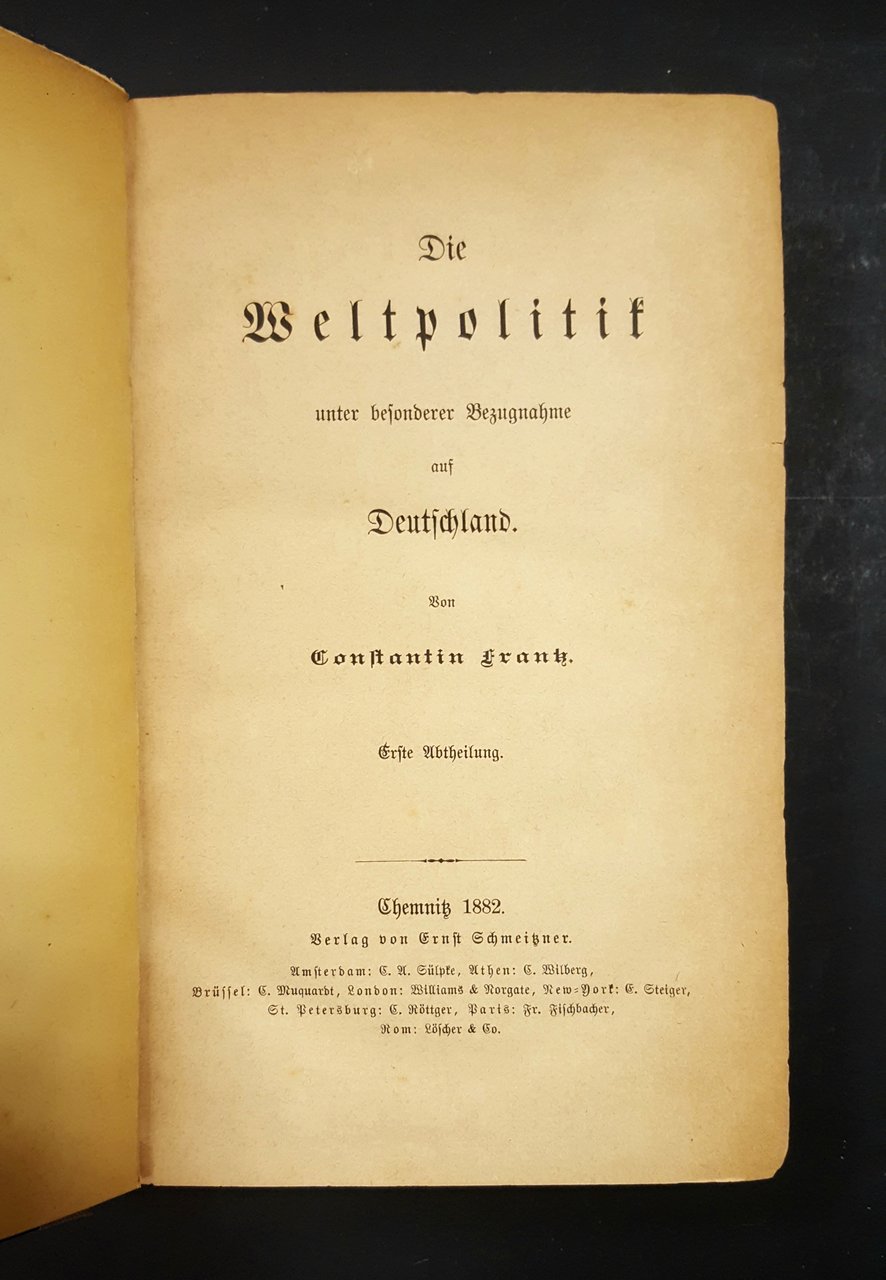 Constantin Frantz Constantin Frantz. Die Weltpolitik unter befonderer Bezugnahme auf Deuteschland. Ernst Schmeitzner. 1882-1883. Chemnitz, Ernst Schmeitzner 1882-1883 german, in ottavo pp. VIII, 162; 173, (3); 221, [7] 3739