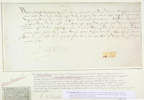 Constitution de fidéjussion et de rente à souldre dans la monnaie courante du comté de Roussillon, passée en présence des consuls de Saint Jean de Cultas (loci sanctii Johannis Plani de Curtibus), le 2 février 1534.