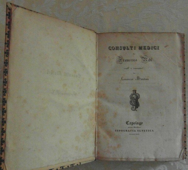 Tipografia Elvetica, 1831. In - 8, mezza tela, pp. 259. Consulti medici scelti e commentati da Lorenzo Martini. Con lievi fioriture, peraltro ben conservato