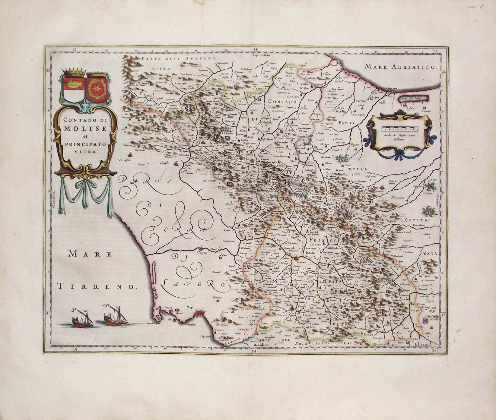 >Incisione in rame, colorata da mano coeva (mm 380 x496 e ampi margini). Tratta dall'edizione latina dell'Atlas Novus pubblicato ad Amsterdam nel 1640 ca. Esemplare fresco e marginoso. (Blavius o Guilielmus Caesius o Guilielmus Jansonius). Cartografo olandese (Uitgeest 1571-Amsterdam 1638). Allievo a Praga dell'astronomo Tycho Brahe, nel 1599 si stabilì ad Amsterdam, dove iniziò la pubblicazione di atlanti e carte geografiche e la costruzione di mappamondi. Nel 1633 fu nominato cartografo della Repubblica. Alla sua morte l'azienda proseguì per opera dei suoi due talentuosi figli Cornelius (1616-1648) e Johannes (1596-1673) che ampliarono l'ambizioso progetto cartografico del padre. L'Atlas Major è il risultato dell'immenso lavoro dei Blaeu ed è riconosciuto unanimamente come uno dei momenti più alti nella storia della cartografia. Il lavoro dei Blaeu si interruppe nel 1672 quando il grande incendio di Amsterdam distrusse l'officina e gran parte delle lastre. L'anno seguente Johannes morì e le lastre rimanenti vennero disperse e acquistate dai rivali Frederick De Wit, Schenk e Valk. La casa editrice chiuse definitivamente nel 1695.