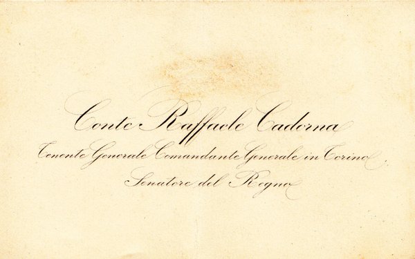 biglietto da visita del Conte Raffaele Cadorna, Tenente Generale Comandante Generale in Torino, Senatore del Regno; buon es.