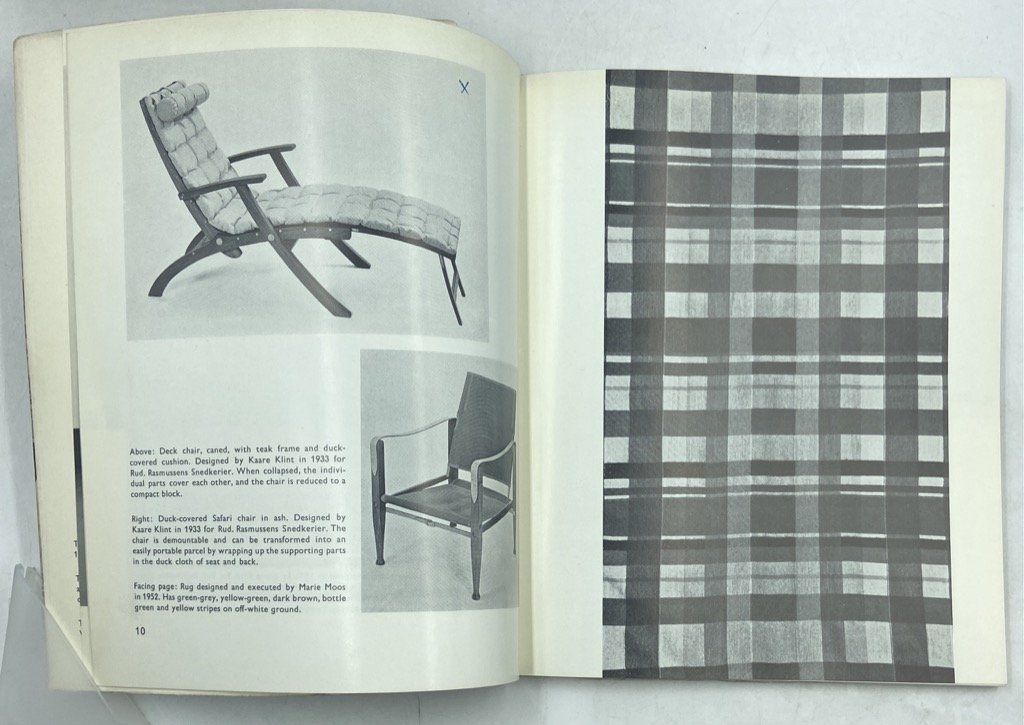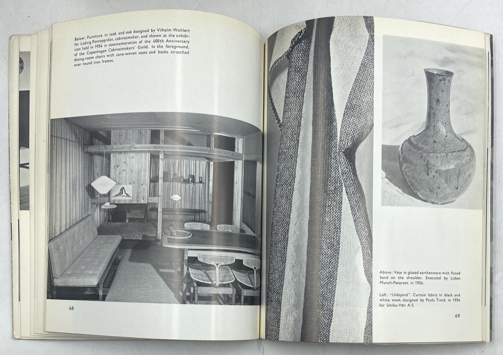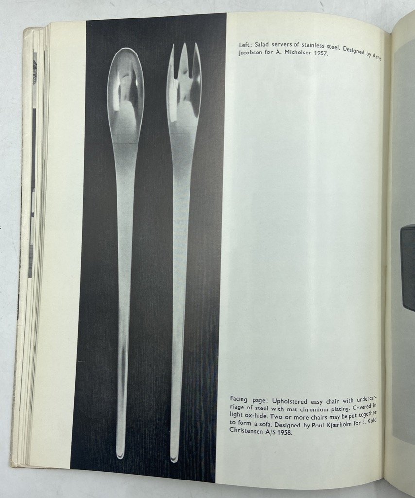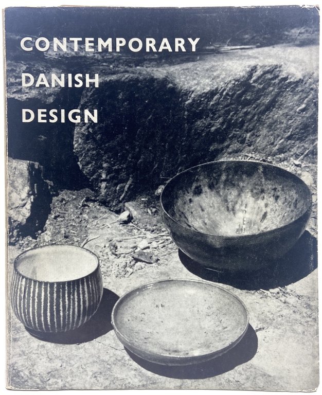 Brossura editoriale illustrata con risvolti, cm 21. 5 x 17, pp 117 (3) copiosamente illustrate da immagini fotografiche in nero. Testo in inglese. Buono stato di conservazione. Ex libris sul primo contropiatto, una decina di oggetti segnati con una X a penna sul bordo dell’immagine, lievi ordinari segni del tempo sulla copertina. Interessante repertorio di design danese pubblicato dagli architetti e storici del design Arne Karlsen, Bent Salicath e Mogens Utzon-Frank sull’onda del successo epocale della mostra itinerante «Design in Scandinavia», che nella seconda metà degli anni ’50, toccando diverse sedi negli Stati Uniti e in Canada, contribuì a definire e rendere popolare il concetto di design scandinavo come ancora oggi lo conosciamo. Il volumetto, impaginato da Arne Karlsen e con testi tradotti da Birthe Andersen, illustra con numerose fotografie mobili, utensili, ceramiche, vetri, tessuti, gioielli, tappeti e lampadari disegnati e prodotti in Danimarca dagli anni '30 alla fine degli anni '50. Oggetti di Lis Ahlmann, Jacob E. Bang, John Becker, Kirsten Becker, Sigvard Bernadotte, Viggo Boesen, Kay Bojesen, Edith Sonne Bruun, Axel Brüel, Hans Bunde, Gudrun Meedom Bæch, Ruth Christensen, Jørgen Ditzel, Nanna Ditzel, Lisa Engqvist, Gutte Eriksen, Helga Fight, Arje Griegst, Ole Hagen, Aage Helbig Hansen, Karl Gustav Hansen, Poul Henningsen, Marianne Herlufsdatter, Erik Herløw, Georg Hetting, Peter Hjorth, Ruth Hull, Peter Hvidt, Ingetoft, Arne Jacobsen, Søren Georg Jensen, Anne Jeppesen, Torsten Johansson, Finn Juhl, Arne Karlsen, Edvard Kindt-Larsen, Tove Kindt-Larsen, Jacob Kjær, Richard Kjærgard, Poul Kjærholm, Esben Klint, Kaare Klint, Vibeke Klint, Ea Koch, Mogens Koch, Henning Koppel, Nathalie Krebs, Herbert Krenchel, Nils Kähler, Ejner Larsen, Marie Gudme Leth, Greth Lindblad, Finn Lynggaard, Per Lütken, A. Bender Madsen, Grethe Meyer, Rolf Middleboe, Børge Mogensen, Marie Moos, Lisbet Munch-Petersen, O. Mølgaard Nielsen, Inger Møller, Ibi Trier Mørch, Tormond Olesen, Bent Gabrielsen Pedersen, Lise Plum, Chr. Poulsen, Jens H. Quistgaard, Franka Rasmussen, Peder Rasmussen, Erik reiff, Dorte Raaschou, Ebbe Sadolin, Axel Salto, Søren Sass, Henning Seidelin, Magnus Stephensen, Eva Stæhr-Nielsen, Julianna Sveinsdottir, Lars Thirslund, Anna Thommesen, Paula Trock, Conny Walther, Ole Wanscher, Gertrud Vasegaard, Myre Vasegaard, Kristian Vedel, Tusta Wefring, Berte Weggerby, Hans J. Wegner, Vilhelm Wohlert, e Gudrun Stig Aagaard.