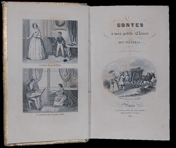 In 8° (17,2x10,3 cm); (2), 188 pp. e 12 c. di tav. copresi antiporta e primo frontespizio inciso. Bella legatura editoriale romantica in cartoncino rigido con ricchi intarsi floreali su sfondo in oro. Qualche lieve segno del tempo ma nel complesso in buone condizioni. Allinterno esemplare in buone-ottime condizioni di conservazione con leggera ed uniforme brunitura come tipico delle edizioni Langlume et Peltier. Qualche nota antica a matita. Curatissima veste grafica con testatine e finalini ornati. Bellissime le 12 tavole fuori testo ognuna con due vignette che riprendono passi del testo. Prima edizione di questo interessante scritto della nota educatrice e filantropa Madame Wetzel. Lautrice fa parte di quella schiera di autrici di estrazione cattolica che nella Francia post-rivoluzionaria contribuirono con il loro impegno ed i loro scritti ad educare le nuove generazioni formando un nuovo genere letterario-pedagogico. Le tavole dellopera riproducono scene di vita di pargoli in atteggiamenti positivi come le letture in famiglia, i ritratti, la voliera di casa, le gite in campagna ed i giochi a suono del violino ma anche in scene negative di egoismo o pericolose attività. Esemplare completo della sua non comune legatura originale. Bibl.: Gumuchian No.5823.