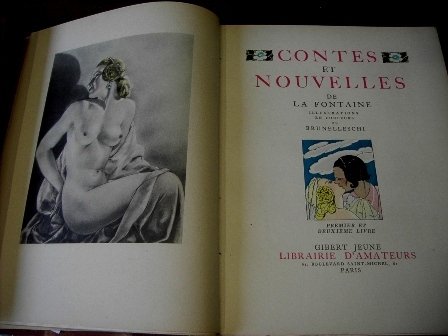 Opera in due volumi in 4, bella legatura in mezza pelle con grandi unghie, titolo inciso ai dorsi decorati con illustrazione erotica impressa e dorata, e nervi ornamentali, sguardie marezzate e bianche seguenti e finali, doppi frontespizi ed antiporta a colori, (14) 164 (10) pp.; (8) 233 (11) pp. Cinque parti in due volumi per questa bellissima edizione, impaginata a cura di Louis Malexis, riccamente illustrata con 32 tavole f.t. a colori di Umberto Brunelleschi, con coloritura originale a pochoir eseguita sottola direzione dell'artista E. Charpentier, tutte a soggetto erotico e galante, oltre a numerosissime illustrazioni in bianco e nero intercalate nel testo, tiratura in 3000 esemplari numerati (ns. n. 540). In bello stato di conservazione. Opera piacevolissima, rientra fra i capolavori del Brunelleschi illustratore e dell' illustrazione erotica del Novecento. Preziosa e scarsamente reperibile.
