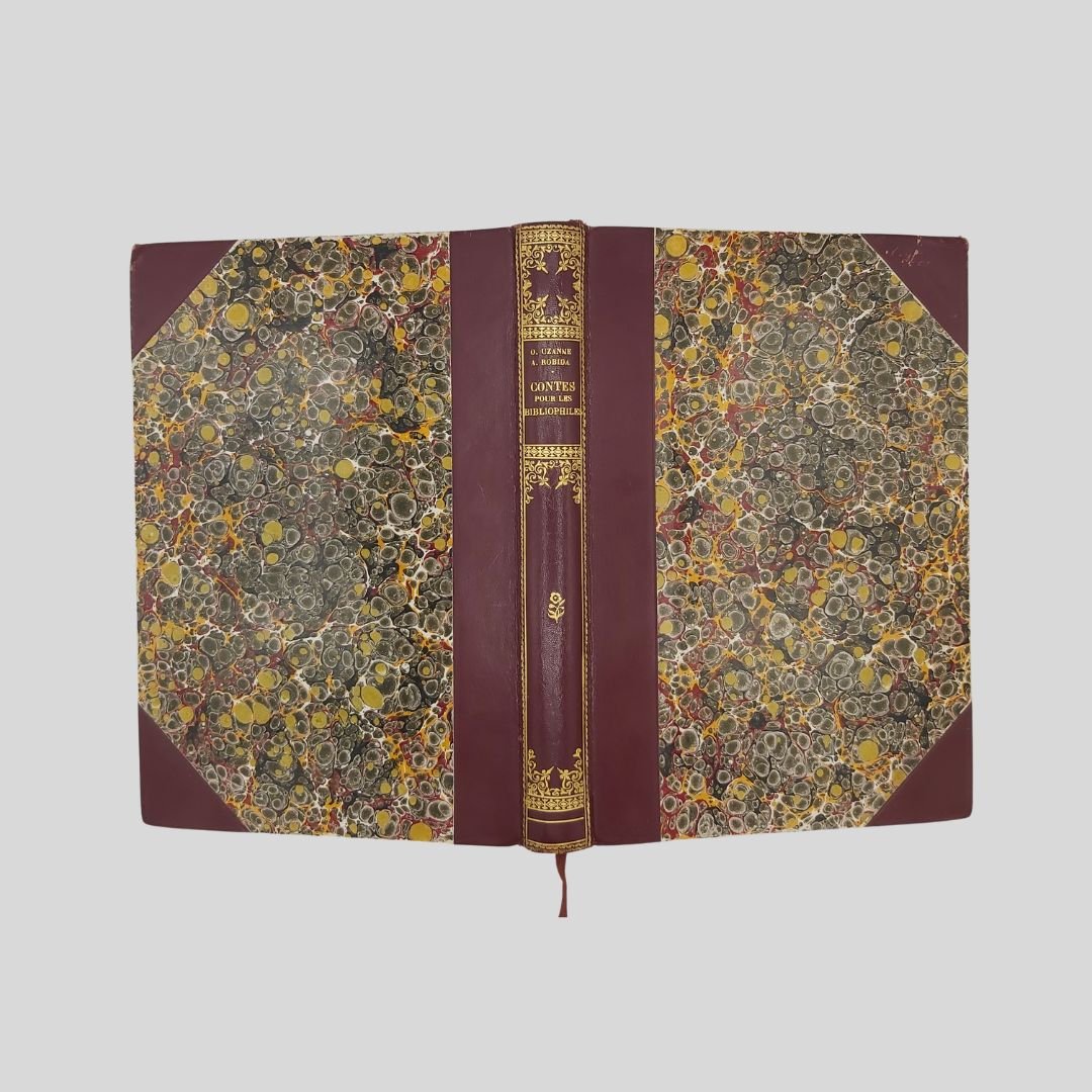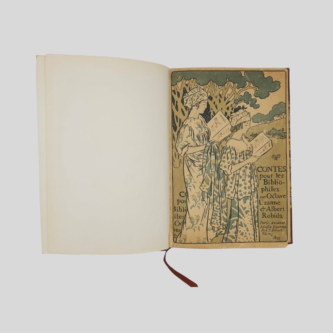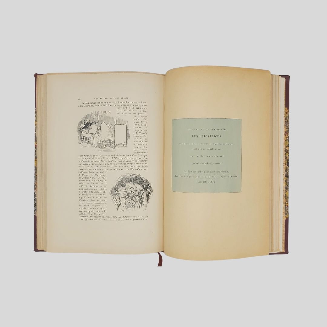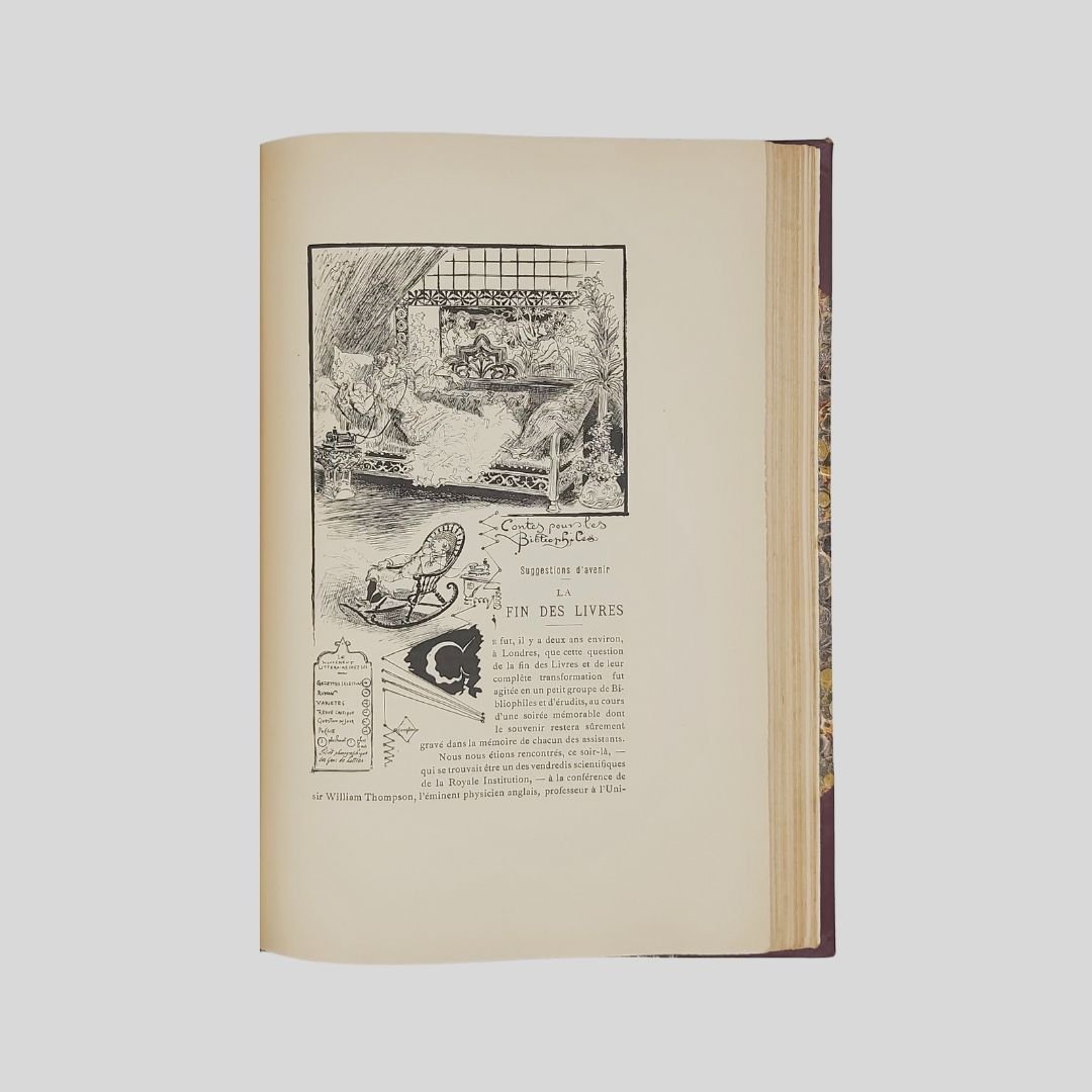 (Colophon: 27 novembre 1894). In-4° (mm 300×200), pp. (IV), 227. Frontespizio in rosso e nero con bella vignetta a colori stampata à la poupée. Con numerose figg. in n. nel testo; 18 tavole fuori testo, protette da velina, di cui 2 acqueforti originali di Albert Robida L’Almanach des Muses 1789 e Le bibliothécaire hypnotiseur e 4 colorate a mano. L’opera fu stampata in 1030 copie, di cui 30 sur papier Japon de luxe (numerati da I a XXX) e 1000 sur papier vélin. Il nostro esemplare è contrassegnato con il n° 605. Fu inoltre stampata una tavola “libera” Les Fricatrices, una scena saffica di Fragonard, in 300 esemplari, venduti a parte (pour la nature du sujet), come indicato a pagina 184, assolutamente rara e quindi difficilmente reperibile in volume. Elegante legatura in mezzo marocchino rosso a punte; titoli e fregi in oro ai picc. ferri al dorso; segnapagina in seta rossa. Conserva le belle copertine editoriali art déco illustrate da George Auriol. Eccetto lievi tracce d’uso all’angolo superiore, eccellente, fresco esemplare. Il volume contiene i seguenti racconti: Un Almanach des Muses de 1789 ; L’Héritage Sigismond, luttes homériques d’un vrai bibliofol ; Le Bibliothécaire Van Der Boëcken de Rotterdam ; Un Roman de Chevalerie franco-japonais ; Les Romantiques inconnus ; Le Carnet de Notes de Napoléon Ier ; La Fin des Livres ; Poudrière et Bibliothèque ; L’Enfer du Chevalier de Kerhany, étude d’éroto-bibliomanie ; Les Estrennes du Poète Scarron, et enfin, onzième et dernier conte, Histoire de Momies, récits authentiques.<BR>In questo volume appare per la prima volta il racconto "La Fin des Livres": «Credo che se i libri hanno un loro destino, questo destino, ora più che mai è prossimo a compiersi, il libro stampato sta per scomparire. Dopo di noi, la fine dei libri!». Octave Uzanne dipinge una società futuristica (XX secolo) dominata dal fonografo a cilindro che ha ormai sostituito il libro di carta: «I lettori ascolteranno i libri con il fonografo», preconizzando l’avvento degli audiolibri. Per la sua modernità La fin des livres sarà ripubblicato numerose volte alla fine del XX secolo. Luis Octave Uzanne [Auxerre 1852-Saint-Cloud 1931]. Giornalista, bibliofilo, editore, scrittore, saggista, critico letterario e filosofo. È stato uno dei più attivi e attenti bibliofili tra la fine del XIX secolo e i prim del ‘900. Terminati gli studi classici al Collège d’Auxerre, si è stabilito a Parigi dove ha frequentato le classi superiori del collége Rollin ma, a causa della guerra franco-prussiana del 1870-1871, è stato successivamente assegnato a una scuola di Richmond, Inghilterra. Ha proseguito gli studi giuridici fino al 1872. Successivamente ha frequentato la Bibliothèque de l’Arsenal, dove si è legato al bibliotecario Charles Nodier, al giornalista Charles Monselet, allo scrittore Loredan Larchery e allo scrittore e bibliofilo Paul Lacroix. Si è unito inoltre alla Société des Amis des Livres, la prima associazione bibliofila francese.