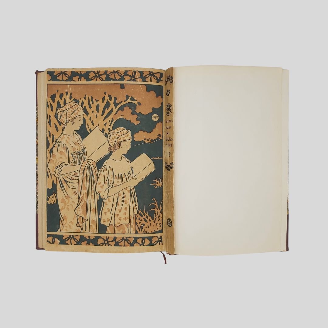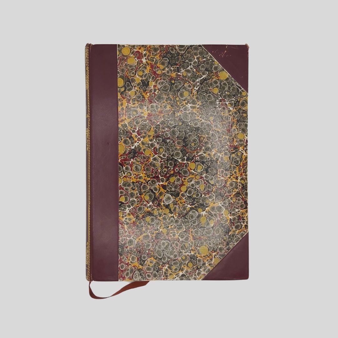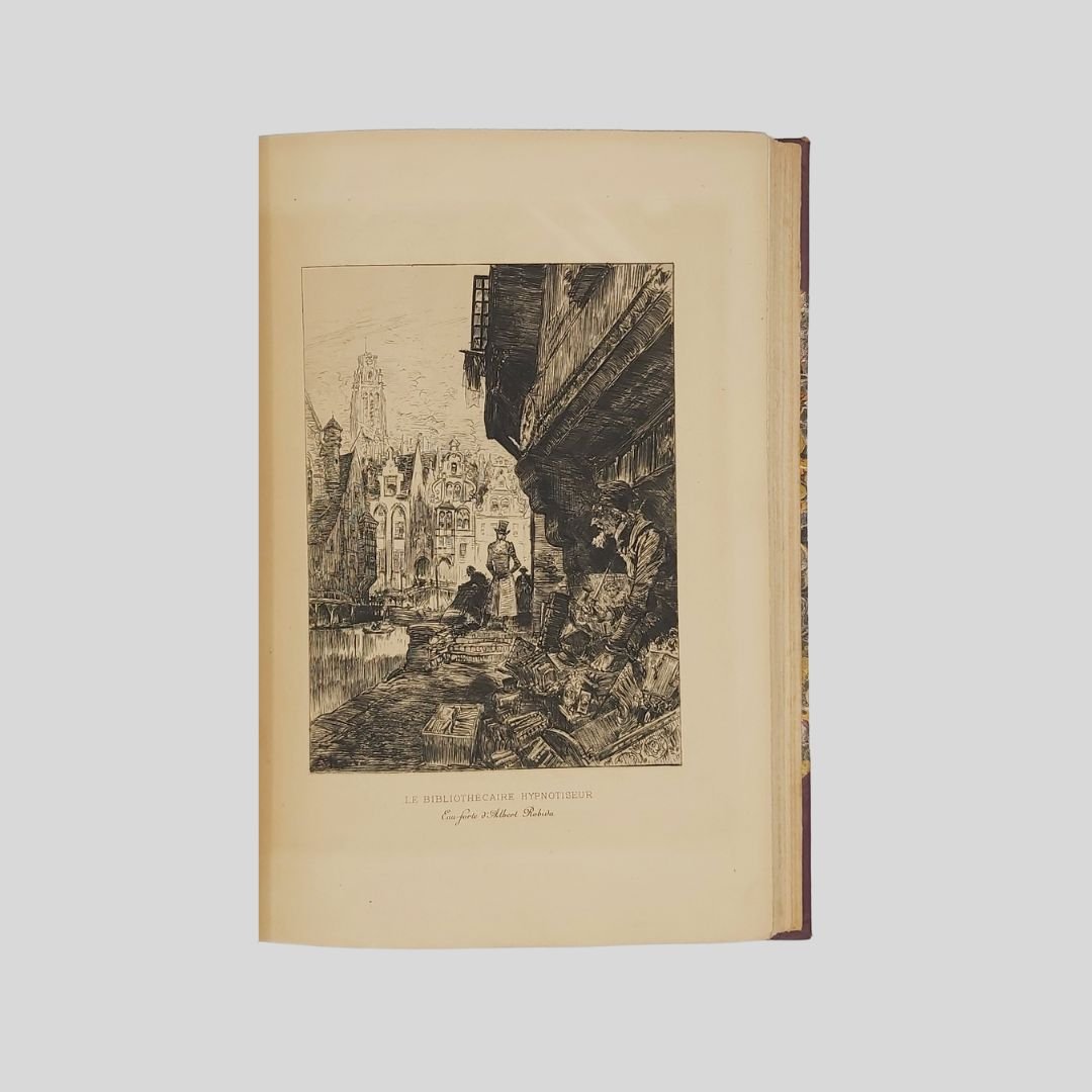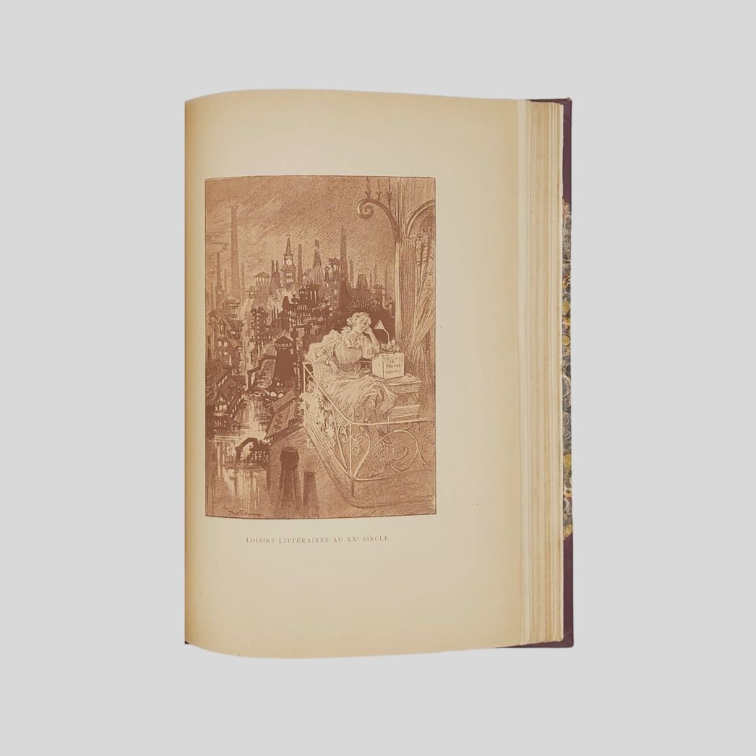 (Colophon: 27 novembre 1894). In-4° (mm 300×200), pp. (IV), 227. Frontespizio in rosso e nero con bella vignetta a colori stampata à la poupée. Con numerose figg. in n. nel testo; 18 tavole fuori testo, protette da velina, di cui 2 acqueforti originali di Albert Robida L’Almanach des Muses 1789 e Le bibliothécaire hypnotiseur e 4 colorate a mano. L’opera fu stampata in 1030 copie, di cui 30 sur papier Japon de luxe (numerati da I a XXX) e 1000 sur papier vélin. Il nostro esemplare è contrassegnato con il n° 605. Fu inoltre stampata una tavola “libera” Les Fricatrices, una scena saffica di Fragonard, in 300 esemplari, venduti a parte (pour la nature du sujet), come indicato a pagina 184, assolutamente rara e quindi difficilmente reperibile in volume. Elegante legatura in mezzo marocchino rosso a punte; titoli e fregi in oro ai picc. ferri al dorso; segnapagina in seta rossa. Conserva le belle copertine editoriali art déco illustrate da George Auriol. Eccetto lievi tracce d’uso all’angolo superiore, eccellente, fresco esemplare. Il volume contiene i seguenti racconti: Un Almanach des Muses de 1789 ; L’Héritage Sigismond, luttes homériques d’un vrai bibliofol ; Le Bibliothécaire Van Der Boëcken de Rotterdam ; Un Roman de Chevalerie franco-japonais ; Les Romantiques inconnus ; Le Carnet de Notes de Napoléon Ier ; La Fin des Livres ; Poudrière et Bibliothèque ; L’Enfer du Chevalier de Kerhany, étude d’éroto-bibliomanie ; Les Estrennes du Poète Scarron, et enfin, onzième et dernier conte, Histoire de Momies, récits authentiques.<BR>In questo volume appare per la prima volta il racconto "La Fin des Livres": «Credo che se i libri hanno un loro destino, questo destino, ora più che mai è prossimo a compiersi, il libro stampato sta per scomparire. Dopo di noi, la fine dei libri!». Octave Uzanne dipinge una società futuristica (XX secolo) dominata dal fonografo a cilindro che ha ormai sostituito il libro di carta: «I lettori ascolteranno i libri con il fonografo», preconizzando l’avvento degli audiolibri. Per la sua modernità La fin des livres sarà ripubblicato numerose volte alla fine del XX secolo. Luis Octave Uzanne [Auxerre 1852-Saint-Cloud 1931]. Giornalista, bibliofilo, editore, scrittore, saggista, critico letterario e filosofo. È stato uno dei più attivi e attenti bibliofili tra la fine del XIX secolo e i prim del ‘900. Terminati gli studi classici al Collège d’Auxerre, si è stabilito a Parigi dove ha frequentato le classi superiori del collége Rollin ma, a causa della guerra franco-prussiana del 1870-1871, è stato successivamente assegnato a una scuola di Richmond, Inghilterra. Ha proseguito gli studi giuridici fino al 1872. Successivamente ha frequentato la Bibliothèque de l’Arsenal, dove si è legato al bibliotecario Charles Nodier, al giornalista Charles Monselet, allo scrittore Loredan Larchery e allo scrittore e bibliofilo Paul Lacroix. Si è unito inoltre alla Société des Amis des Livres, la prima associazione bibliofila francese.