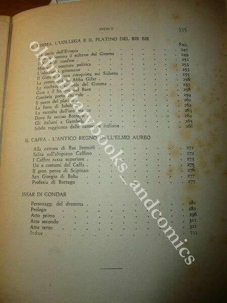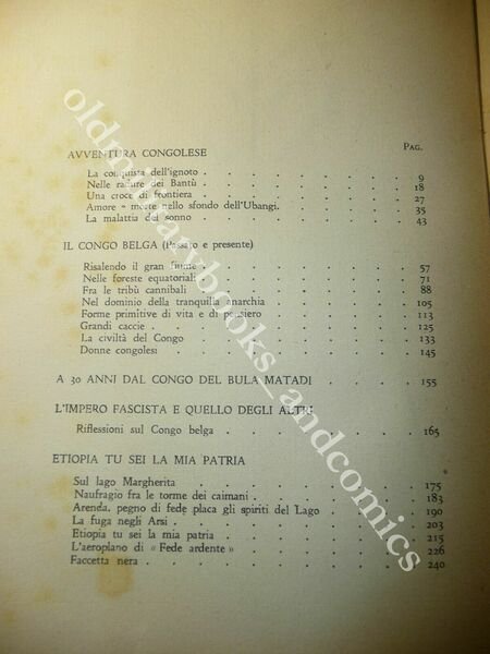 "DESCRIZIONE: Vettorini Roma 1937 I^ Ed., br. ed. con sovracc. ill. con risvolti, pp. 331, notevole apparato fotografico di grande valore storico composto di 105 illustrazioni e due cartine in 8°. Interessante volume del 1937 sull'Africa di Arnaldo Cipolla giornalista e scrittore del Corriere della Sera corrispondente dall'Africa. L'opera descrive il Congo belga e l'Etiopia. Alla fine del volume il dramma "Issar di Gondar". Tra gli argomenti trattati: Bantù, La malattia del sonno, Tribu cannibali, Donne congolesi, Lago Margherita, Faccetta nera, Sultano del Gimma, Islamismo gimmano, Abba Gifar, Gambela, fossa di Jubdo, Italiani a Gambela, Salita sull'altipiano Caffino, Usi e costumi del Caffa, Ponte di Scipinao, San Giorgio di Baha, Profezia di Bottego ecc. CONDIZIONI: Discrete/Buone piccole mancanze alla cop. e lievi tracce di fox alle pagine. Il vecchio proprietario ha scritto il titolo del libro, a matita, sul dorso. PESO / WEIGHT: 700 gr. without package"