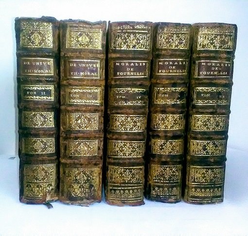 In-8, cinque volumi, tomi II, III, IV, V, VI. viij, pp. 826, viij, pp. 892, xiv, pp 820, xvj, pp. 757, xiij, pp. 820. Paris, Apud Viduam R. Mazières & J.B. Garnier. Differenti edizioni, con minime variazioni al frontespizio. Solide legature coeve francesi in pelle di vitello. Dorsi a cinque nervi con titolo e ornamenti floreali in oro, tagli in rosso, sguardie marmorizzate. Legature con segni di usura da sfregamento ma ben conservate, qualche mancanza e escoriazioni superficiali. Qualche quaderno parzialmente slegato al volume III, e uno al volume V. Interno ben conervato, ottimo stato della carta. In-8, five volumes, volumes II, III, IV, V, VI. Paris, Apud Viduam R. Mazières & J.B. Garnier. Different editions, with minimal variations in the title page. Contemporary French binding in calfskin. Five bands spines with title and floral ornaments in gold, red edges, marbled endpapers. Bindings with signs of wear but well preserved, some lacks and superficial abrasions. A partially unattached bundle of pages, 543-554 in volume V, and some bundles in volume III. Inside, good paper condition.