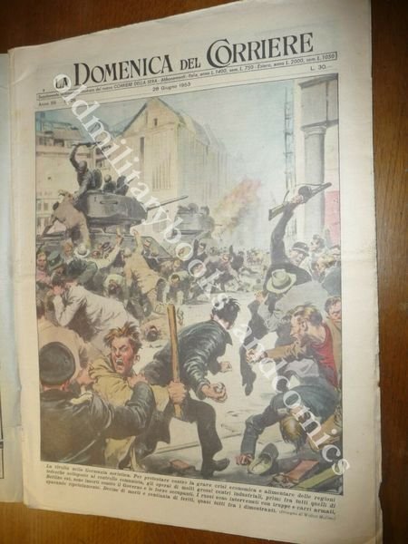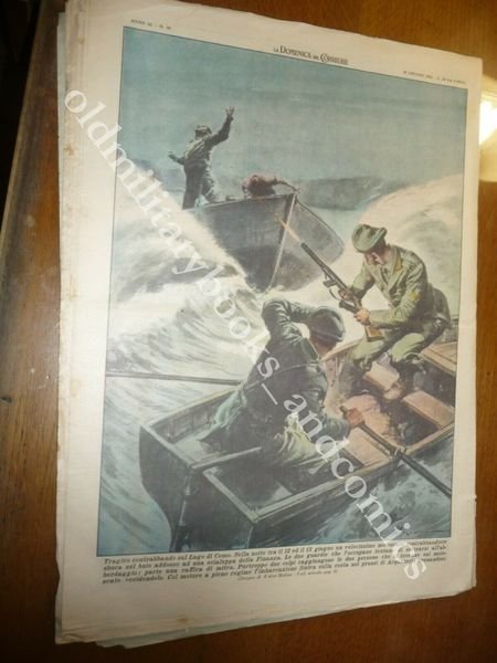 DESCRIZIONE: Domenica del Corriere, Milano, Anno 55 n. 26 (28 GIUGNO 1953). COPERTINA: Contrabbando sul lago di Como, parte una raffica di mitra che uccidono i contrabbandieri. RETRO: Rivolta delle popolazioni della Germania sottoposta al controllo sovietico. La Domenica del Corriere è stato un popolare settimanale italiano fondato a Milano nel 1899 e chiuso nel 1989. Apparve per la prima volta nelle edicole l'8 gennaio 1899 come supplemento illustrato del Corriere della Sera. Stampata in grande formato (sul modello del domenicale La Tribuna illustrata), aveva 12 pagine e veniva distribuita gratis agli abbonati del Corriere, oppure si poteva acquistare in edicola per 10 centesimi. La prima e ultima di copertina erano sempre disegnate. Il Corriere si avvaleva di un giovane disegnatore, Achille Beltrame, allora sconosciuto, a cui veniva affidato in ogni numero il compito di rendere con la sua tavola il fatto più interessante della settimana. Dopo la sua morte nel 1945, fu sostituito da Walter Molino che, come il suo predecessore, firmò memorabili copertine. A differenza dei settimanali dell'epoca, la Domenica del Corriere diede ampio spazio alle fotografie e ai disegni, e questo fu uno dei motivi del suo successo. CONDIZIONI: Discrete con azzurrina. PESO / WEIGHT: 200 gr. without package