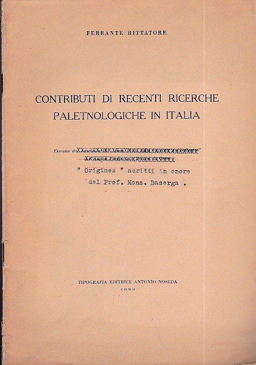 In-8°, pp. 16, brossura editoriale. 4 tavv. f.t. Ottimo stato. Al piatto la dicitura editoriale della pubblicazione da cui la memoria è estratta è cassata ed è stata corretta in 'Origines', scritti in onore del Prof. Mons. Baserga.