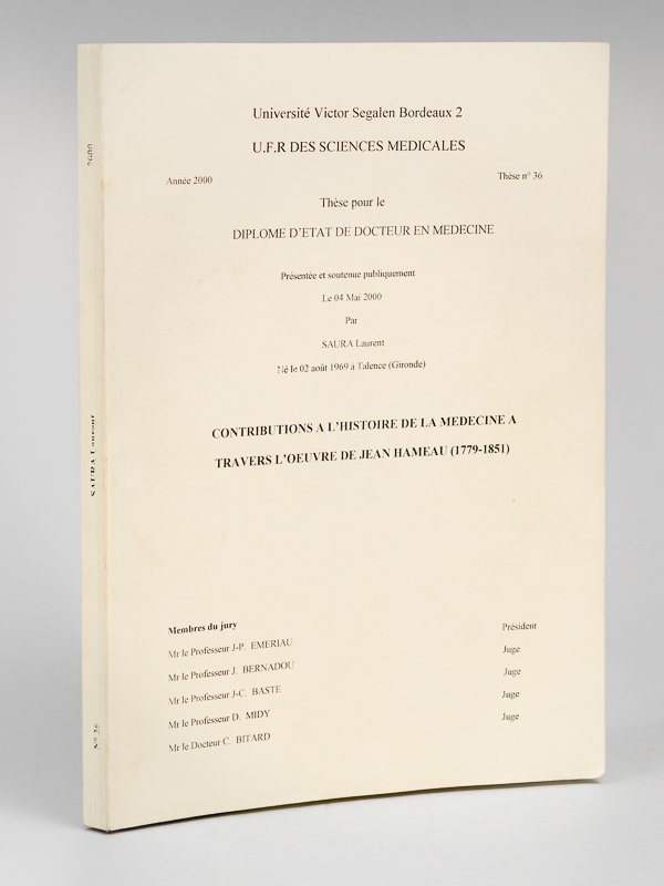 Contributions à l'histoire de la Médecine à travers l'oeuvre de Jean Hameau (1779-1851). Thèse pour le Diplôme d'Etat de Docteur en Médecine présentée et soutenue publiquement le 4 mai 2000