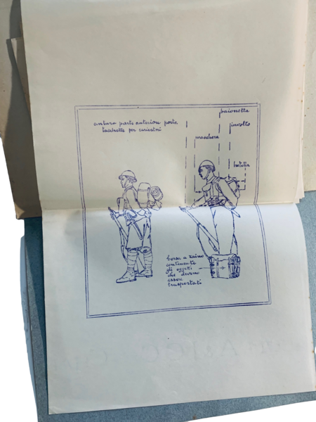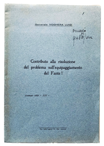 In 4°; (8) pp. e 8 c. di tav. più volte ripiegate con schemi del nuovo equipaggiamento proposto per le unità di fanteria. Prima ed unica edizione di questo progetto per un nuovo equipaggiamento per le truppe di fanteria del reale esercito italiano, scritto dal Generale Luigi Voghera. Ottimo esemplare.