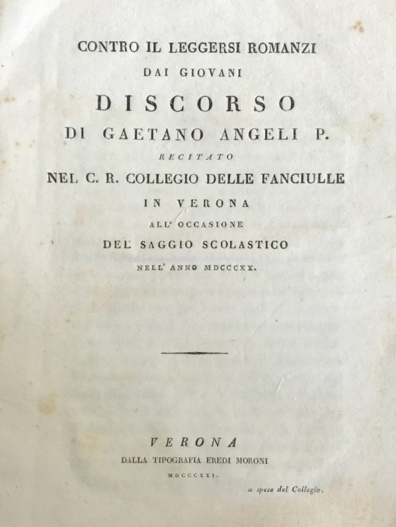 Contro il leggersi romanzi dai giovani. Discorso recitato nel C. R. Collegio delle Fanciulle in Verona all'occasione del saggio scolastico nell'anno 1820.