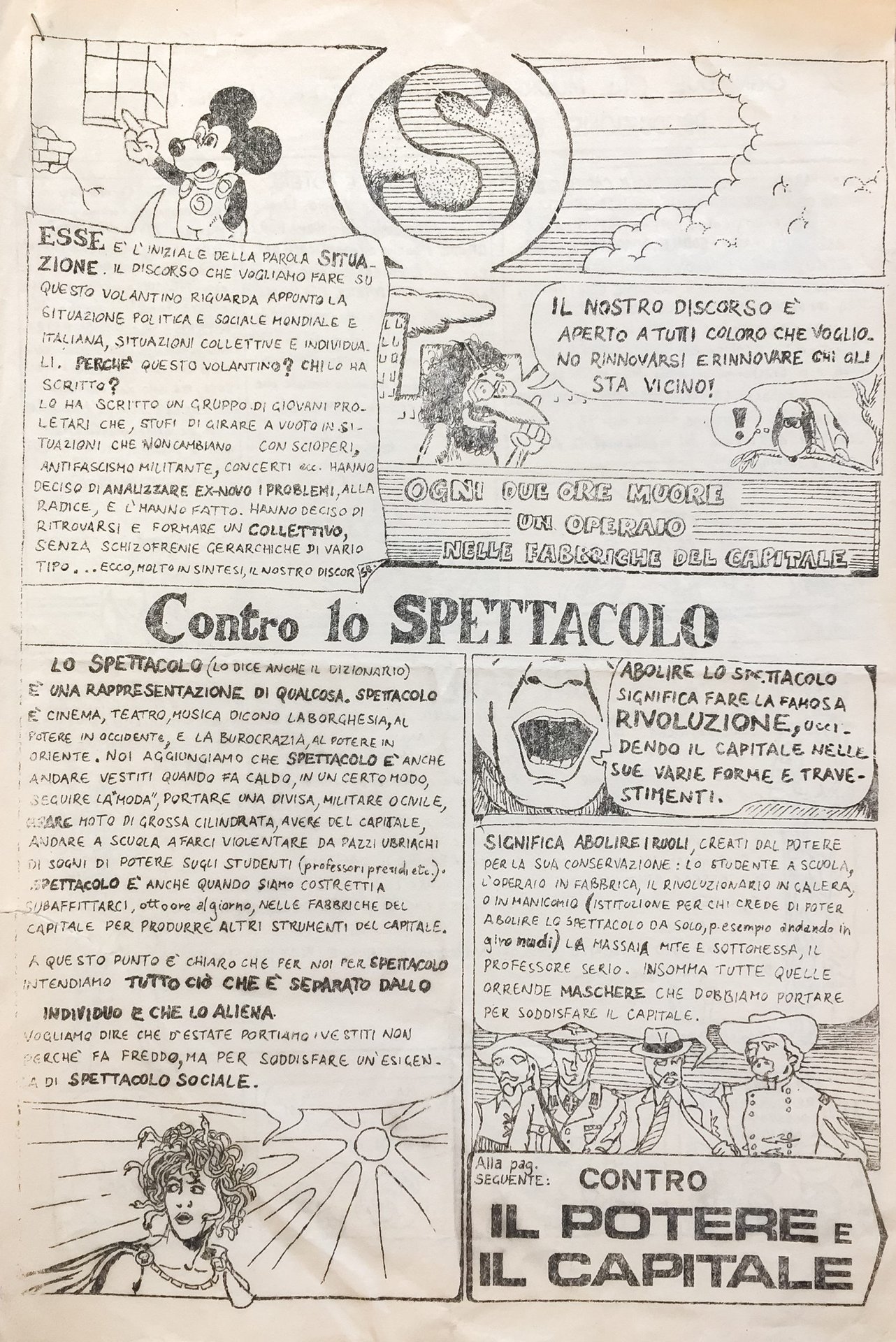 Abolire lo Spettacolo significa fare la famosa rivoluzione, uccidendo il capitale nelle sue varie forme e travestimenti. Volantino post-situazionista riccamente illustrato, composto da due fogli pinzati, con detournement (anche) di fumetti Disney e Peanuts. All'ultima pagina. "Deturnare significa demistificare una situazione, o un atteggiamento, etc. dal significato che le è stato dato dal capitale, per ricondurla al suo vero significato rivoluzionario". Uno strappo di qualche centimetro alle due carte che non preclude la leggibilità del testo.