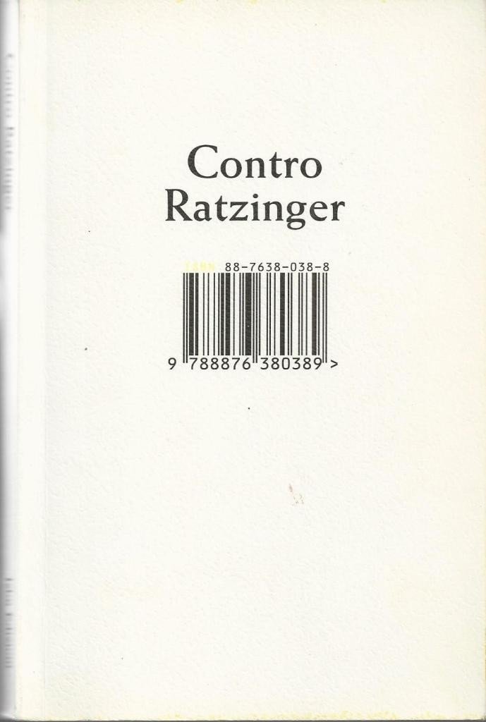 Contro Ratzinger. Pamphlet, Isbn Edizioni, Milano 2006, pp. 158, cm 19, br. ed. con tagli spruzzati. Pamhlet anonimo su papa Benedetto XVI. All’interno, conservata recensione al volume intitolata Torna l’Anonimo a sorridere del Papa (estratto da Panorama del 7 dicembre 2006). Leggere tracce d’uso, per il resto ben conservato.
