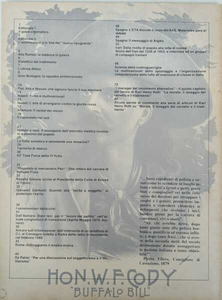 In -4°,bross edit ill – pag. 80 – numerose ill. in b/n nel testo – sommario nella foto ultima di copertina. Estratti dal sommario: Il golpe cibernetico. Alfa Romeo: la fabbrica in galera. Il caporalato nel sud. “Rispondo al mercenario Peci”. Una lettera dal carcere di Raffaele Fiore. Scienza della controguerriglia. - buono stato, segni d'uso