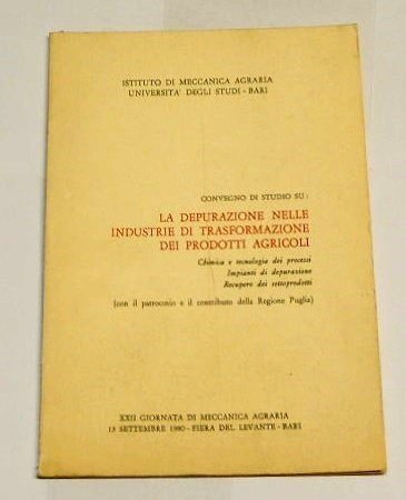 Istituto di Meccanica agraria - Università degli studi Bari, Convegno di studi su: La depurazione nelle industrie di trasformazione dei prodotti agricoli. Chimica e tecnologia dei processi, impianti di depurazione, recupero dei sottoprodotti. XXII Giornata di Meccanica Agraria 13 settembre 1980 – Fiera del Levante – Bari, s.n., s.l. (ma stampato a Bari, Edizioni Quadrifoglio) 1982, pp. 133, cm 24, br. ed. Relazioni di: Paolo Amirante, Vito Nicola Pantaleo, Ciro Testini, Mario Polemio, Fernando Tateo, Roberto Chiumenti, Emanuele Di Candia, Carlo Mongelli, Lamberto Baccioni. Firma d'appartenenza alla prima pagina, minime tracce d'uso alla brossura, per il resto buon esemplare. Molto raro.
