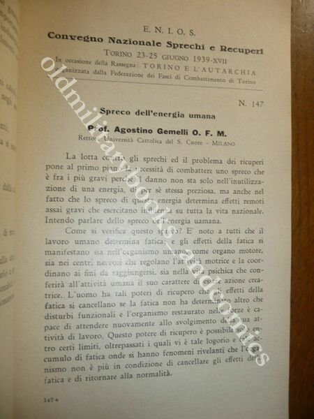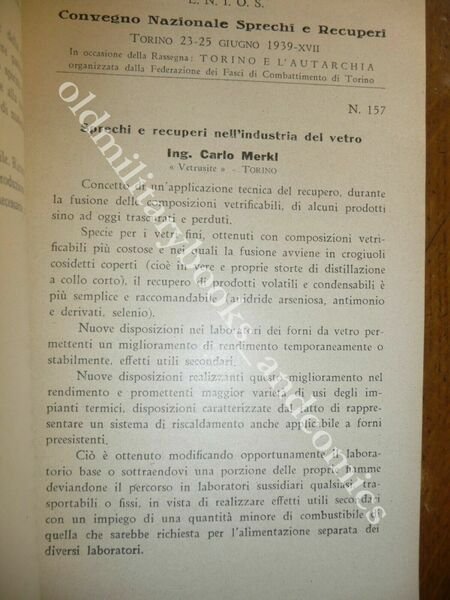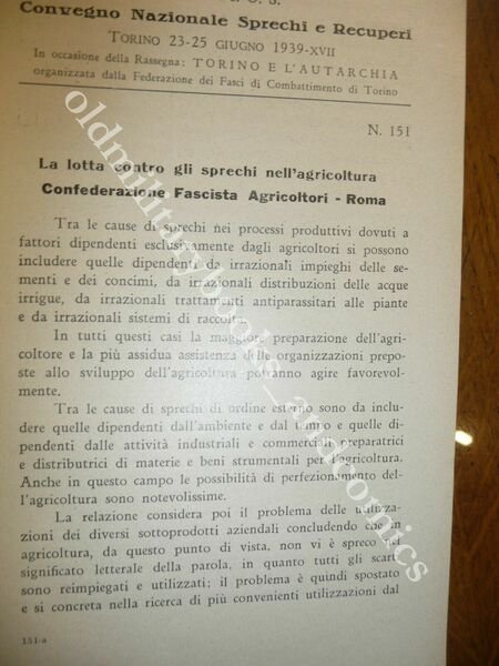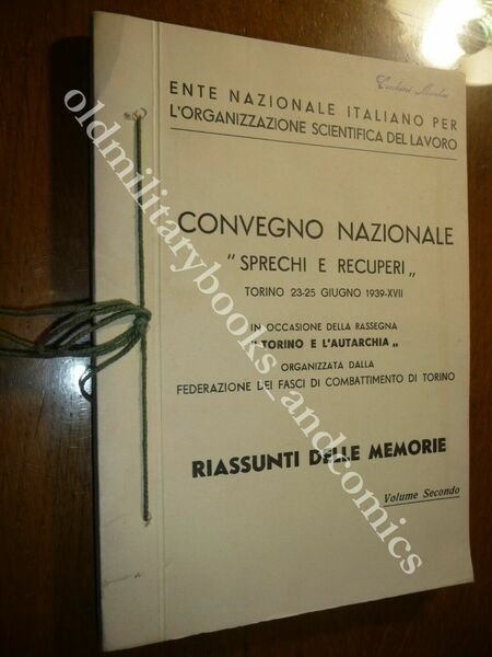 "TITOLO:CONVEGNO NAZIONALE SPRECHI E RECUPERI Vol. Secondo DESCRIZIONE: Ferri Roma 1939, br. ed. Cartoncino edit. con cordoncino passante presso il dorso articoli dal n. 145 al n. 195 in 8°. Sulla cop.: In occasione della Rassegna "Torino e l'autarchia", organizzata dalla Federazione dei Fasci di combattimento di Torino. Rifiuti domestici, formati campionari tessuti, controllo combustione, valorizzazione prodotti agricoli siciliani, Municipalizzate, prodotti fotografici, ricupero metano nelle acque di rifiuto urbano e fogne, fonderie, spreco ENERGIA UMANA, prevenzione infortuni, lubrificanti, vetro, luce di Wood, gas, cascami, impianti di riscaldamento, Pirelli, indice di ottano nei carburanti auto e aviazione, elettricità, ecc. UTILE! Rarissimo, censito solo in due biblioteche. CONDIZIONI: Ottime/Perfette. PESO / WEIGHT: 400 gr. without package"