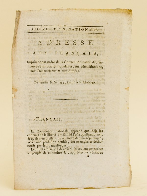 Convention Nationale. Adresse aux Français, imprimée par ordre de la Convention Nationale, envoyée aux Sociétés Populaires, aux administrations, aux Départemens & aux Armées. Du premier Juillet 1793, l'an II de la République ; 1 brochure in-8, sans couv., De l'Imprimerie Nationale, s.d., 4 pp. "Français, La Convention Nationale apprend que déjà les ennemis de la liberté ont falsifié l'acte constitutionnel, & qu'ils s'empressent de répandre dans la République, avec une profusion perfide, des exemplaires déshonorés par leurs mensonges" . "Chez les Athéniens, la loi frappot de mort l'étranger qui s'introduisait dans l'assemblée populaire, parce qu'il usurpoit la souveraineté ; chez les Français libres, qu'il tombe sous le glaive de la justice, celui qui s'introduit dans la pensée même des législateurs, pour en dénaturer les résultats." Bon état. Rare