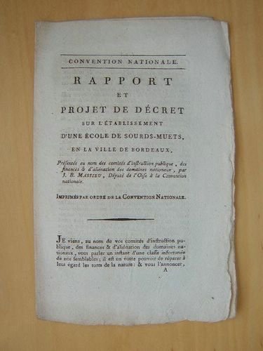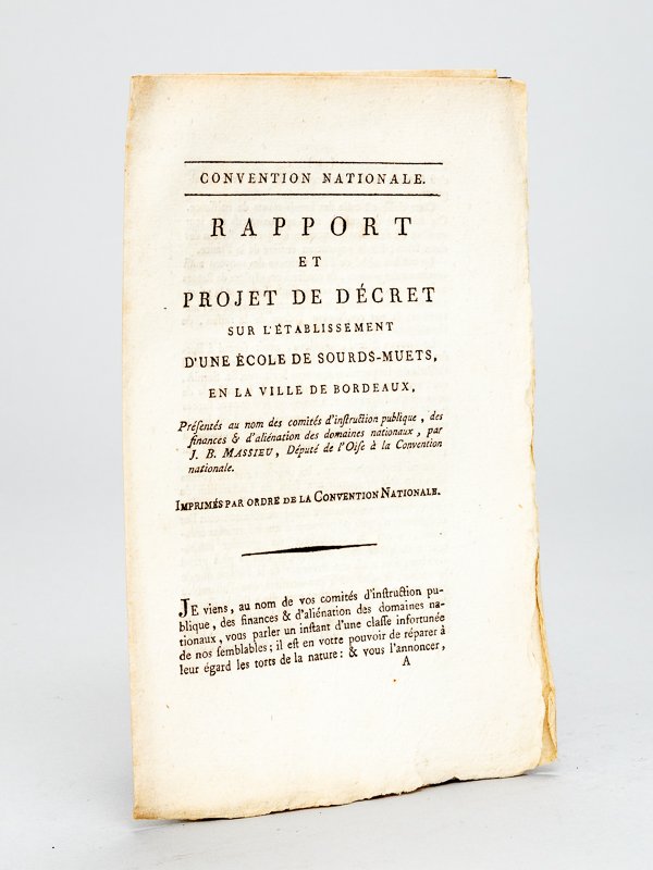 Convention Nationale. Rapport et Projet de Décret sur l'établissement d'une Ecole de Sourds-Muets, en la ville de Bordeaux, présentés au nom des comités d'Instruction publique, des finances & d'aliénation des domaines nationaux, par J. B. Massieu, Député de l'Oise à la Convention Nationale. [ édition originale ]