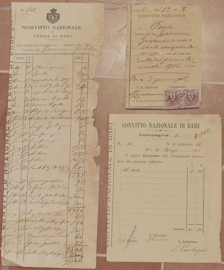 Interessante raccolta di tre documenti del Convitto nazionale di Terra di Bari del 1906 e 1912.Il primo non datato ma dei primi anni del '900 è una fattura. Il secondo è il mandato all'economo per provvedere ad un lavoro di sartoria. Il terzo una ricevuta di pagamento con due marche da bollo di 5 centesimi In discrete condizioni, piegature e mancanze. Dim. cm 31x10,5. Dim. cm 17x12,5. Dim. cm 12,5x8,5. Interesting collection of three documents of Convitto nazionale di Terra di Bari of 1906 and 1912. The first one not dated but of the first years of 1900 is an invoice. The seocnd one is a approval for the accountant for a tailor's job. The third one a receipt with two stamps of 5 cents. In fair conditions, foldings and missing parts.