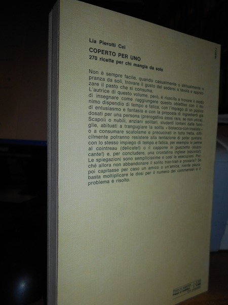 Lia Pierotti Cei. Milano, Mursia Editore, 1977. Coperto per uno 270 ricette per chi mangia da solo. In-16° grande, cartoncino edit. 166. (1) pp. Come nuovo. Neg. cucina mob. 15