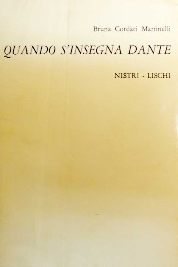 Bruna Cordati Martinelli, Quando s’insegna Dante, Nistri-Lischi, Pisa 1966, pp. 189, cm 17, br. ed. Volume mancante di sovraccoperta, minime tracce d’uso alla brossura, per il resto ben conservato.
