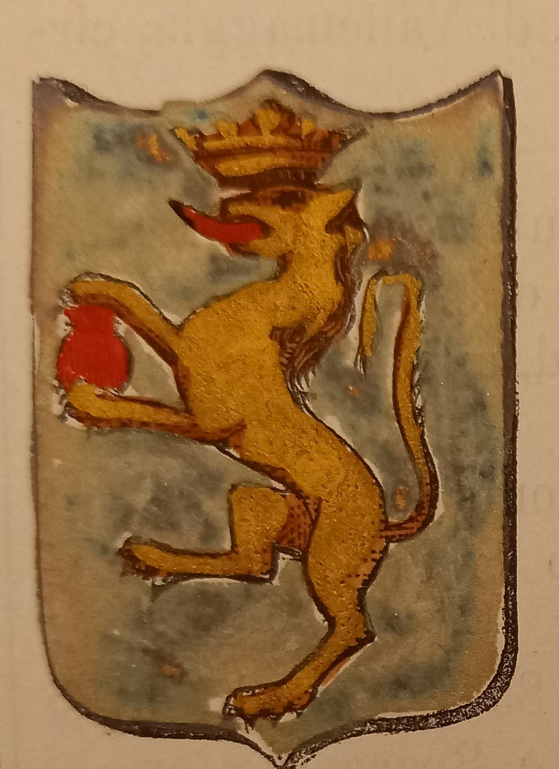 Piccolo stemma comunale colorato a mano d’epoca (cm. 3,8 x 3,2 ca.). Stralcio dal Dizionario Corografico illustrato dell’Italia, edito a Milano nel 1868. Ogni stemma di questa raccolta è inserito in una o più pagine di testo con la descrizione della località, notizie storico - geografiche e statistiche (numero degli abitanti e degli elettori, guarnigioni della Guardia Nazionale, ecc.). Spesso il testo è redatto da studiosi locali o dai sindaci, con maggiori, interessanti notizie.