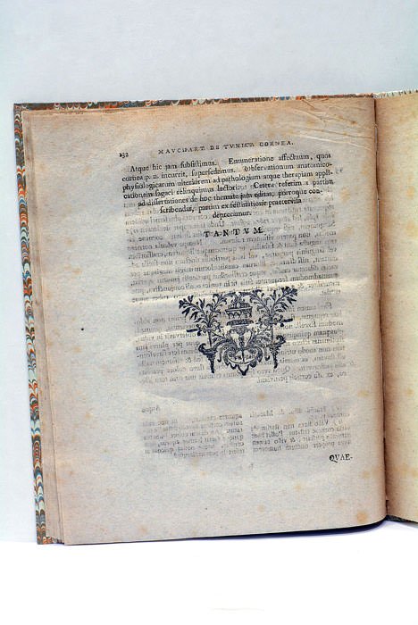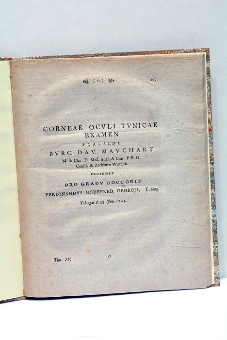 page 105 à 132 (cette thèse est extraite d'un autre ouvrage) (18x21cm). Cartonnage postérieur. Papier légèrement bruni. Rousseurs. Thèse présidée par le célèbre Médecin Burkard David Mauchart. Ophtalmologie.