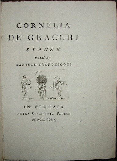 16mo (cm. 16), 1 c.nn., XCVI pp., 16 cc.nn. Graziosa vignetta calcografica al frontespizio e al verso dell’ultima carta. Cartonato rigido coevo con nervi al ds. (lievi tracce d’uso). Ottimo esemplare impresso su carta grave. Edizione originale. Elegante componimento allegorico a carattere pedagogico dell’abate Francesconi (1761-1835) che insegnò storia e diplomazia all’Università di Padova e ne fu il Magnifico Rettore.