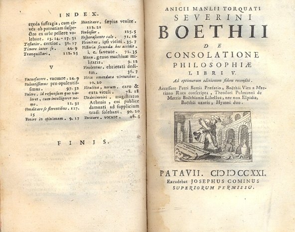 In 16°, p. perg., pp. XXXII + 139 + cc.nn. 18. UNITO. SEVERINI BOETHII. De Consolatione philosophiae. Del 1721. Pp., LXIV + 143. Lettere in o. al d. Front. figurati. Marca tipografica al centro dell'ultima p. Carta e stampa fresche.