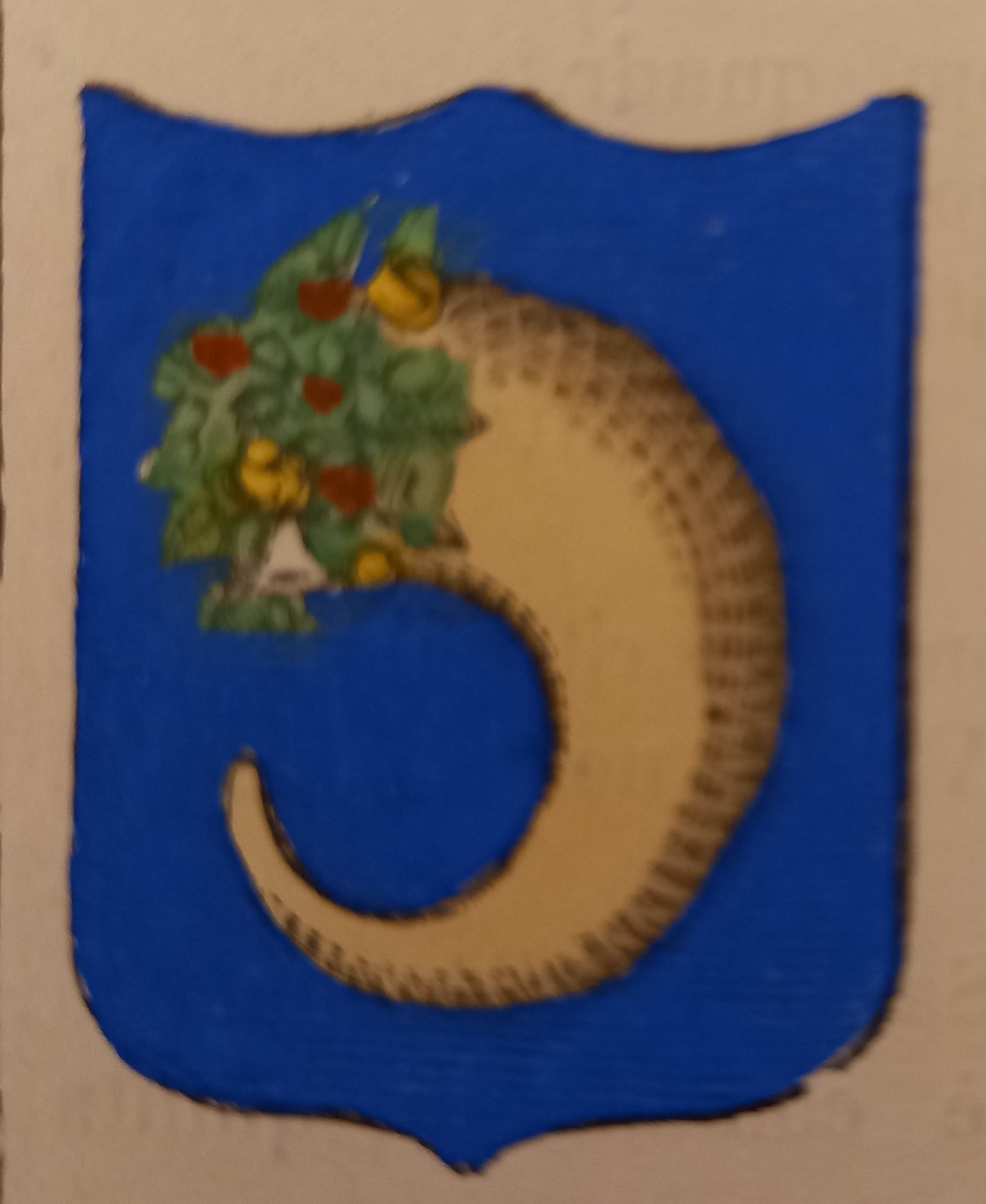 Piccolo stemma comunale colorato a mano d’epoca (cm. 3,8 x 3,2 ca.). Stralcio dal Dizionario Corografico illustrato dell’Italia, edito a Milano nel 1868. Ogni stemma di questa raccolta è inserito in una o più pagine di testo con la descrizione della località, notizie storico - geografiche e statistiche (numero degli abitanti e degli elettori, guarnigioni della Guardia Nazionale, ecc.). Spesso il testo è redatto da studiosi locali o dai sindaci, con maggiori, interessanti notizie.