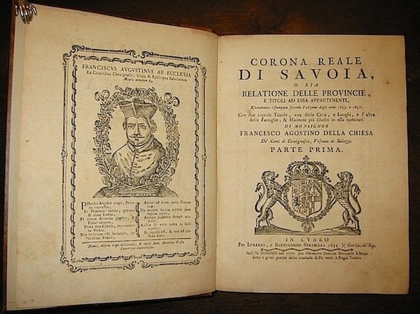 4to (cm. 25,7), 2 Voll., XL-286 pp., 1 c.nn.; XVI-323 pp. Numerosi stemmi e capilettera figurati n.t. Legature ‘900 in mz. pelle con nervi, fregi e titolo oro su doppio tassello nero al ds. Poche macchie marginali altrimenti esemplare in eccellente stato di conservazione. Ristampa della prima edizione di Cuneo (1655-1657). Spreti(965) cita quest’edizione.