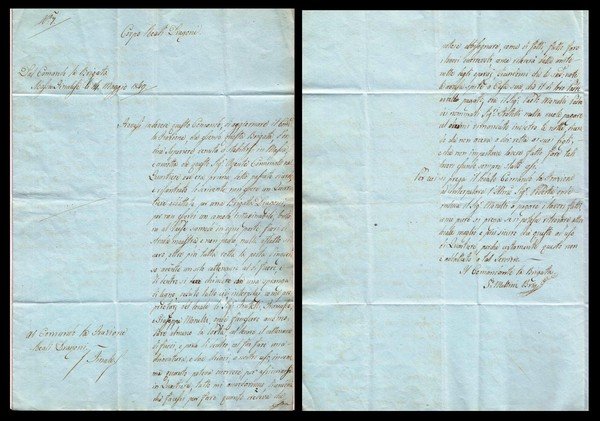 Manoscritto firmato del Comandate per una controversia per il pagamento per dei lavori fatti al portone dell'alloggio del Corpo Reali Dragoni di 2 facciate datata Massa Finalese, 14 Maggio 1849; lieve mancanze all'ultima pag. non scritta; buon es.