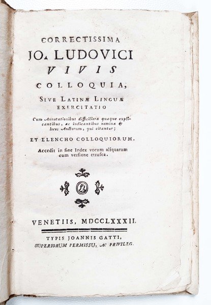 in-12°, 162x102 mm, leg. originale in cartonato mordido muto; pp. 143, [1]. Interessante e poco comune opera dell'umanista spagnolo Juan Luis Vives (1492-1540), nella quale viene proposto un innovativo metodo per studiare il latino, con dialoghi su temi quotidiani, come: Iter et equus; Vestitus et deambulatio; Domus; Culina; Triclinium; Ebrietas; Leges ludi; etc. Rif.: IT\ICCU\URBE\027734. OCLC, 797799694. Cond.: Lievi tracce d'uso alla legatura. Carte in barbe. Esemplare molto buono.