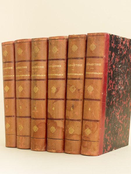6 vol. in-8 reliure demi-basane rouge, Hachette et Cie, Furne, Jouvet et Cie, Paris, 1873, 2 ff., IV-376 ; 2 ff. 482 ; 2 ff. 436 ; 2 ff. 559 ; 2 ff. 591 ; 2 ff. 473 pp. et 1 f. blanc Rare exemplaire bien complet de l'édition originale de la Correspondance de Lamartine. Etat très satisfaisant (mouill. en dos, bonne fraîcheur intérieure et bon état par ailleurs). Vicaire, IV, 1023
