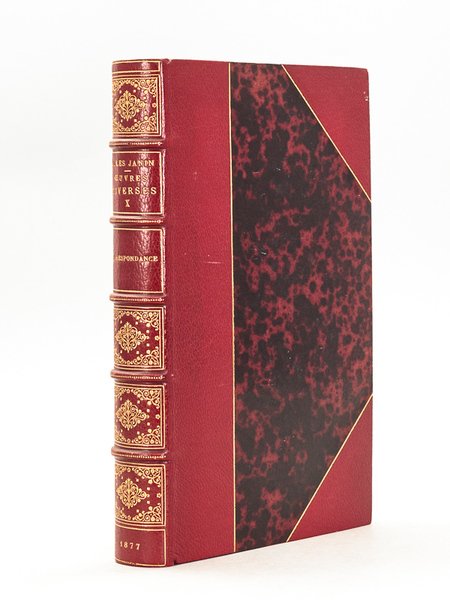 Tomes X des Oeuvres diverses de Jules Janin, portrait gravé par Hédouin, 1 vol. grand in-12 relié demi-maroquin à coins rouge, dos à 5 nerfs dorés richement ornés, filet doré en mors et nerfs, tête dorée, date en queue, reliure signée de Allô, Jouaust, Librairie des Bibliophiles, Paris, 1877, 2 ff. n. ch. (faux-titre et titre), 316 pp. Magnifique exemplaire de cette très belle édition de la Correspondance de Jules Janin,parfaitement établi par Allô dans une splendide reliure en demi-maroquin à coins rouge.