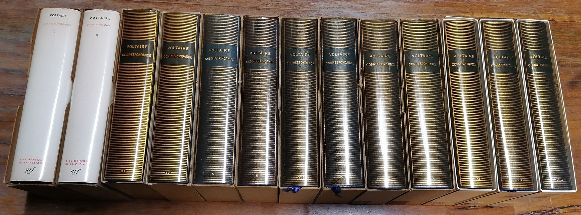 Bibliothèque de la Pléiade. Tredici volumi in 16° grande, legatura editoriale in piena pelle con titoli ed impressioni in oro al dorso, taglio di testa colorato, doppio segnalibro in tessuto. Tomo I e II, sovraccoperta figurata, protezione in acetato trasparente, custodia muta. Tomo III, IV, V, VI, VII, VIII, IX e X, sovraccoperta figurata con dorso in vista, protezione in acetato trasparente, custodia muta. Tomo XI, XII e XIII, protezione in acetato trasparente e custodia figurata. Tomo I : (1704-1738), 1964, pp. XXIV,1735,(1). Tomo II : (1739-1748), 1965, pp. XV,(1),1537,(3). Tomo terzo : (1749-1753), 1975, pp. XVI,1534,(2). Tomo IV : (1754-1757), 1978, pp. XVI,1655,(7). Tomo V : (1758-1760), 1980, pp. XII,1698,(2). Tomo VI : (1760-1762), 1980, pp. XIII,(1),1648,(2). Tomo VII : (1763-1765), 1981, pp. XIII,(1),1590,(12). Tomo VIII : (1765-1767), 1983, pp. XIV,1663,(3). Tomo IX : (1767-1769), 1985, pp. XVII,(1),1601,(11). Tomo X : (1769-1772), 1986, pp. XIV,1648,(2). Tomo XI : (1772-1774), 1987, pp. XV,(1),1411,(13). Tomo XII : (1775-1777), 1987, pp. XVIII,1361,(13). Tomo XIII : (1777-1778), 1992, pp. XI,(1),1203,(1). Volumi in ottimo stato di conservazione.