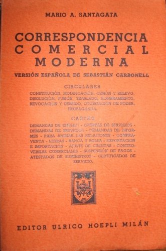 Correspondencia comercial moderna. Versión española de Sebastián Carbonell. Circulares. Constitución, modificación, cesión y relevo, disolución, fusión, traslado, nombramiento, revocación y despido, otorgación de poder, propaganda. Cartas. Demandas de empleo - Ofertas de servicios - Demandas de servicios - Demandas de informes - Para animar las relaciones - Compraventa - Letras - Banca y bolsa - Exportación e importación - Ajuste de cuentas - Controversias comerciales - Suspensión de pagos - Atestados de suministros - Certificados de servicio.