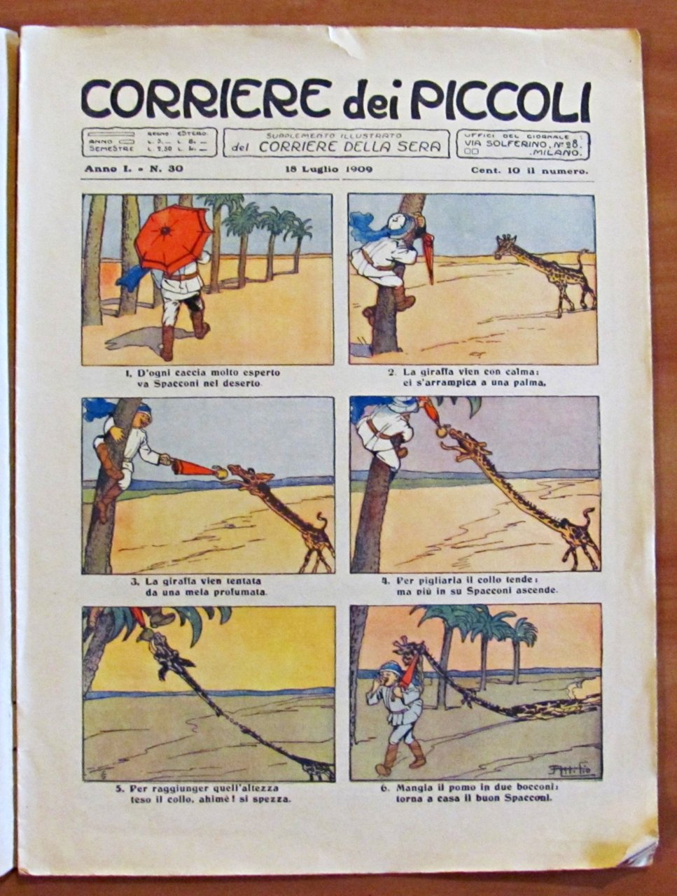 Anno I - N.30 - 18 Luglio 1909. Illustrazioni di Gustavino e Attilio Mussino. Editore Corriere della Sera - Milano, 1909. Brossura editoriale con sovraccoperta. Piccola mancanza all'angolo basso a sinistra che va da pag.5 a pag.12. Piccolo strappo al margine alto della sola sovraccoperta. 22,5x30; pp.16. Copia anastatica dell'originale del 1909. BUONISSIMO STATO