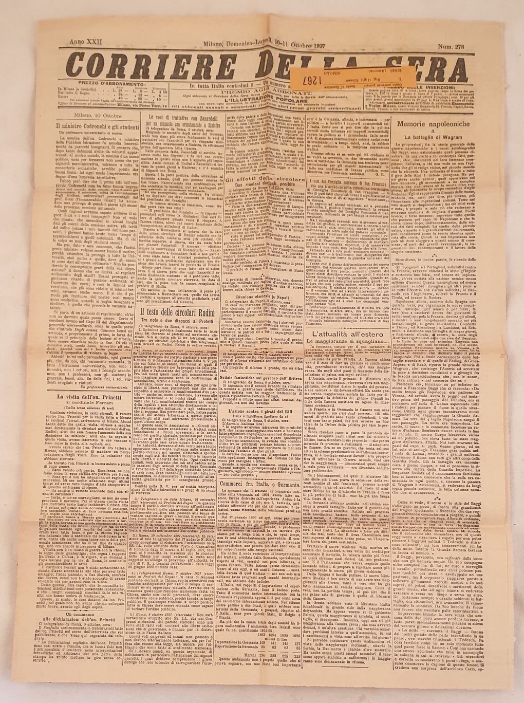 Numero del 10 11 ottobre 1897 di questo storico quotidiano italiano fondato a Milano nel 1876. Tra gli articoli presenti: Il ministro Codronchi e gli studenti, Le voci di trattative con Zanardelli, Il testo delle cricolari Rudini, Memorie napoleoniche La battaglia di Wagram,Riunione clericale a Napoli, La visita dell'On. Prinetti, Commerci fra Italia e Germania, Marinai sotot el armi, Corriere dellle province: Siena Padova Rovigo Ferrara, Un paese lombardo specialista in somosse: Ariuno, Necrologio Monsignor Jacopo Bernardi, La corsa militare di resistenza ecc. Belle pubblicità. Etichette. In buone condizioni.Raro. Brossura editoriale in buone condizioni generali con lievi usure ai margini e dorso. Piegature. All'interno le pagine si presentano in buone condizioni con rare fioriture. Piegature ed usure marginali. In folio. Dim. 59,5x44 cm. Pp. 4.Number of the 10th 11th of october 1897 of this historical daily magazine established in Milan in 1876. Between the issues treated: the Minsitery Codronchi and students, Zanardelli, The txt of decisions Rudini, napoleonic memories: the battle of Wagram,Clergy reunion in Naples, The visit of On. Prinetti, Trades between Italy and Germany, Seamen in war, Corriere dellle province: Siena Padova Rovigo Ferrara, A town in Lombard specialists in riots: Ariuno, Nechrology Monsignor Jacopo Bernardi, Miulitary run of resistance etc. In good conditions. Scarce copy. Editorial cover in good general conditions slightly worn in the edges and spine. Foldings and wearings. Inside pages are in good conditions with foxings. Foldings. In folio. Dim. 59,5x44 cm. Pp. 4.