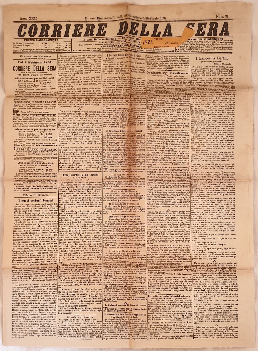 CORRIERE DELLA SERA MILANO DOMENICA LUNEDI 31 GENNAIO 1 FEBBRAIO 1897